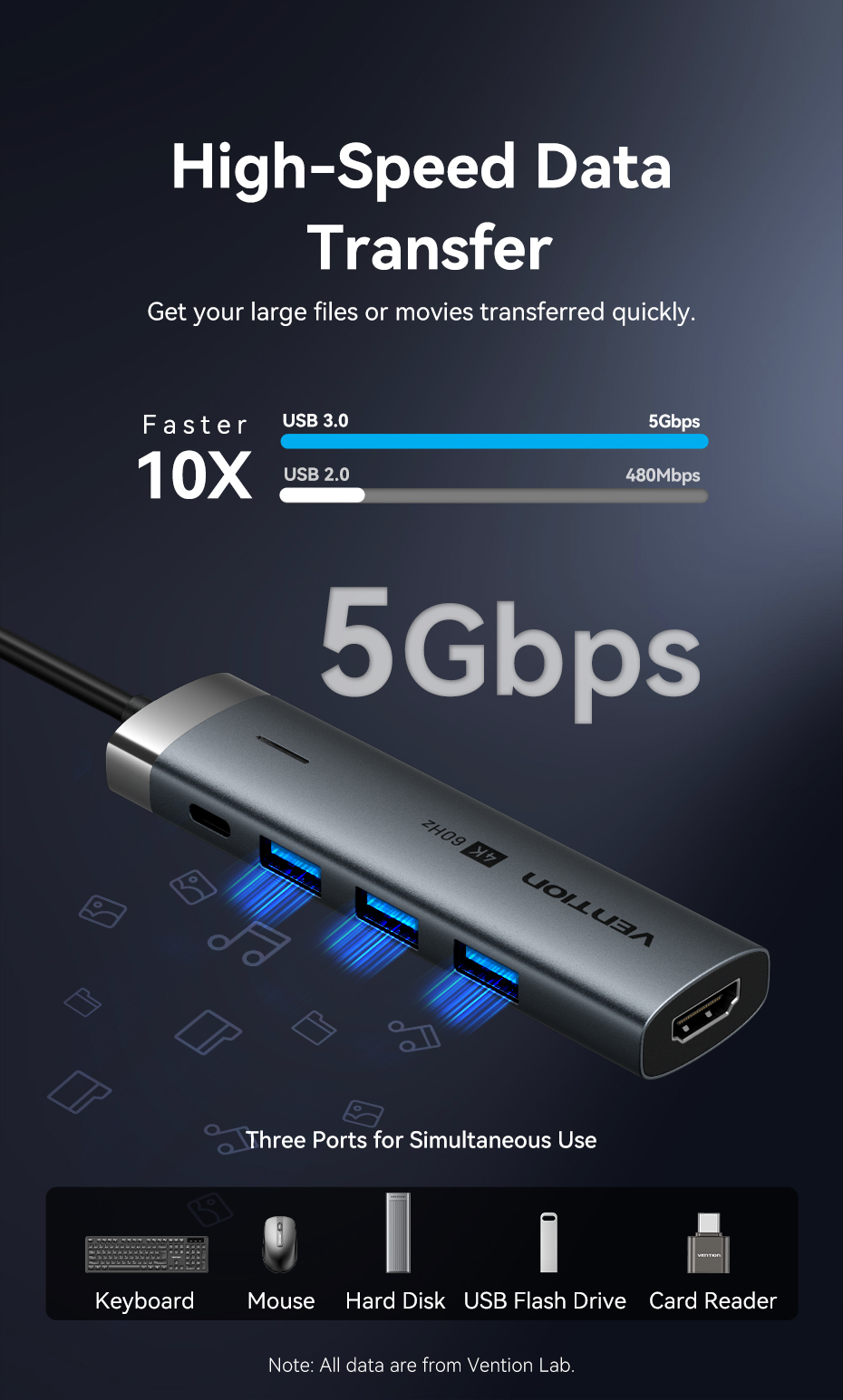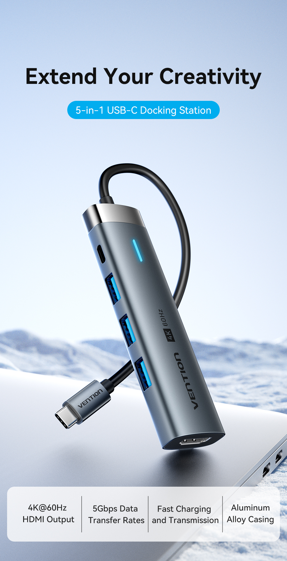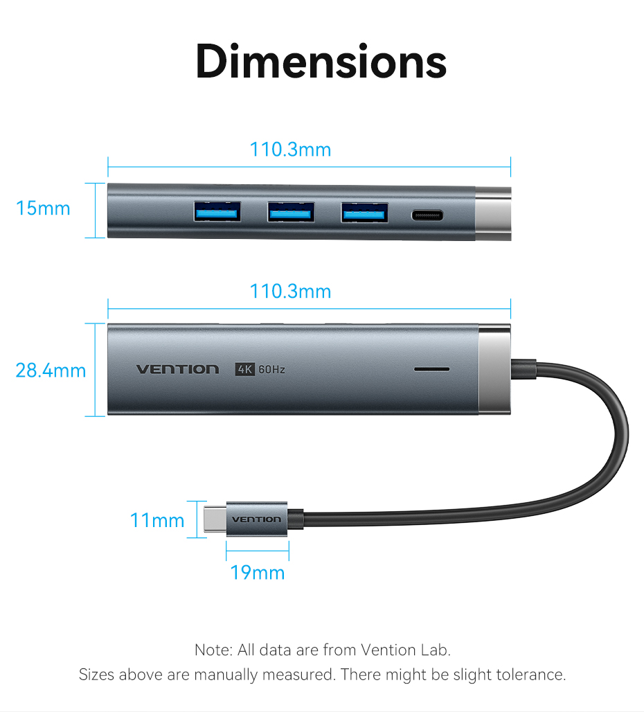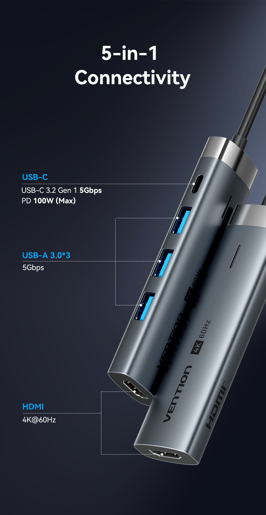 Hub USB C Vention 5 trong 1 cổng với 4k 60hz 5Gbps PD100w C sang HDMI USB 3.0 cho máy tính xách tay