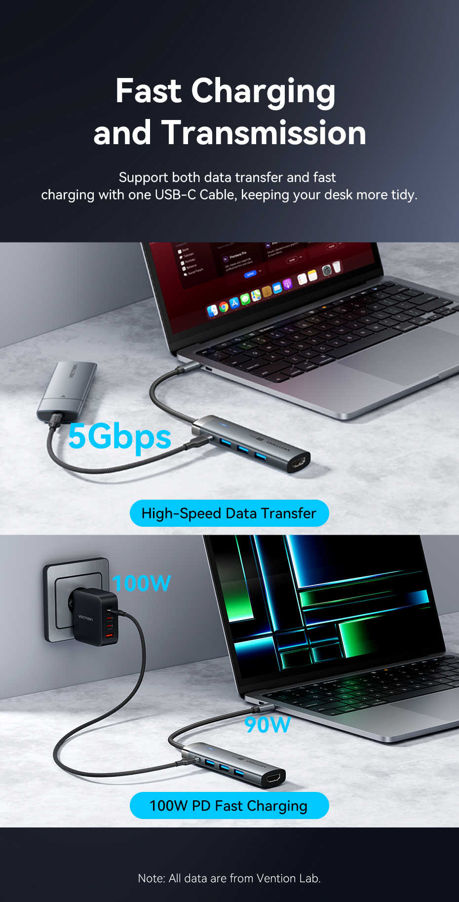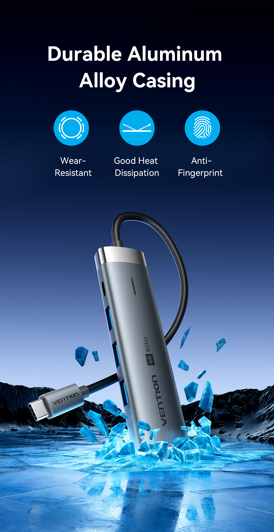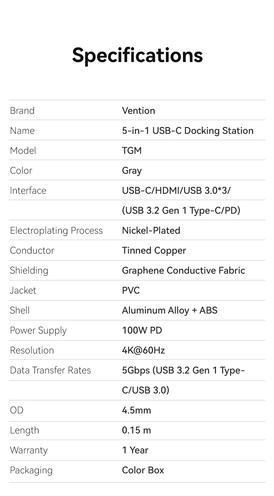 Hub USB C Vention 5 trong 1 cổng với 4k 60hz 5Gbps PD100w C sang HDMI USB 3.0 cho máy tính xách tay