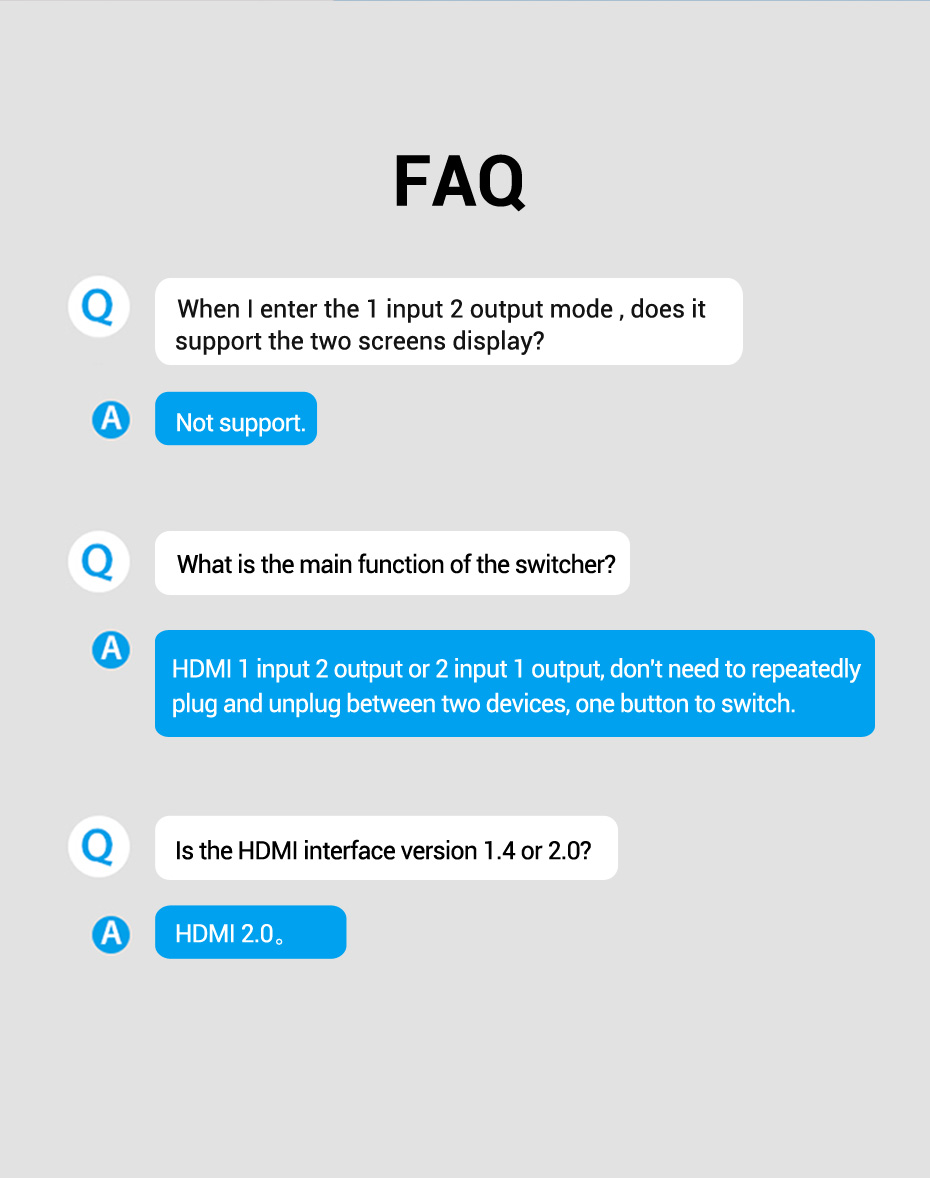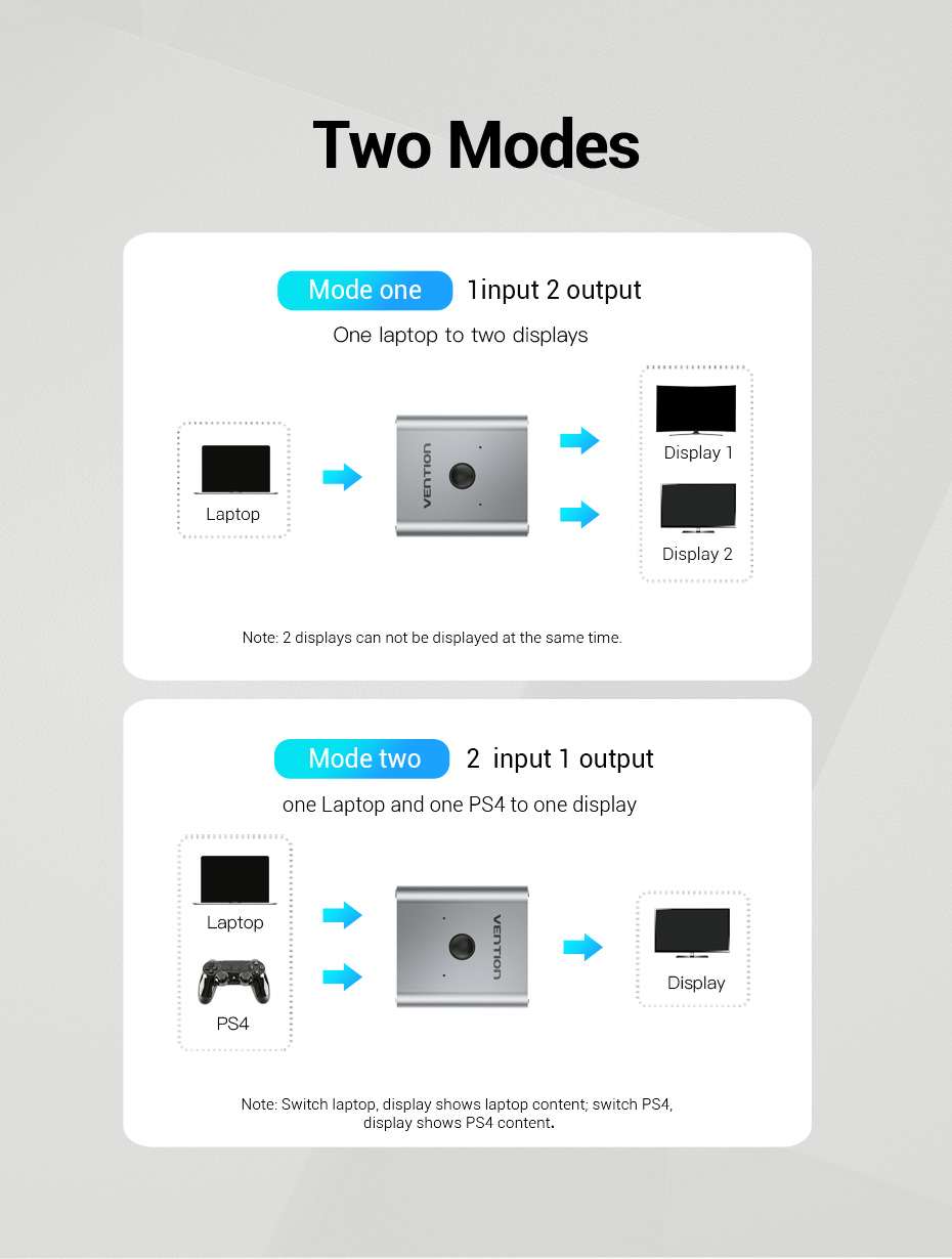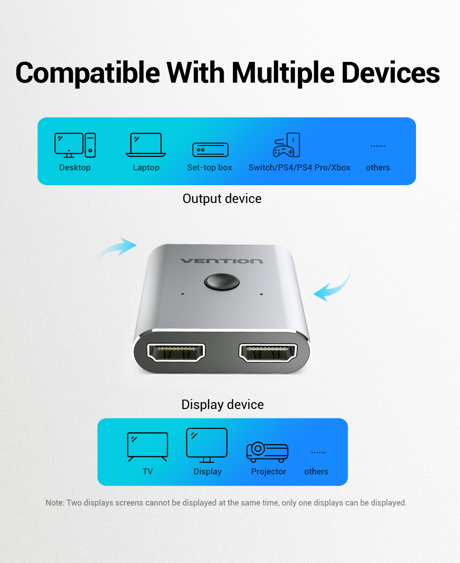 2) .Hoạt động như một bộ chia HDMI, kết nối máy tính xách tay để chuyển đổi giữa 2 màn hình, nhấn nút để chọn màn hình bạn muốn xem.