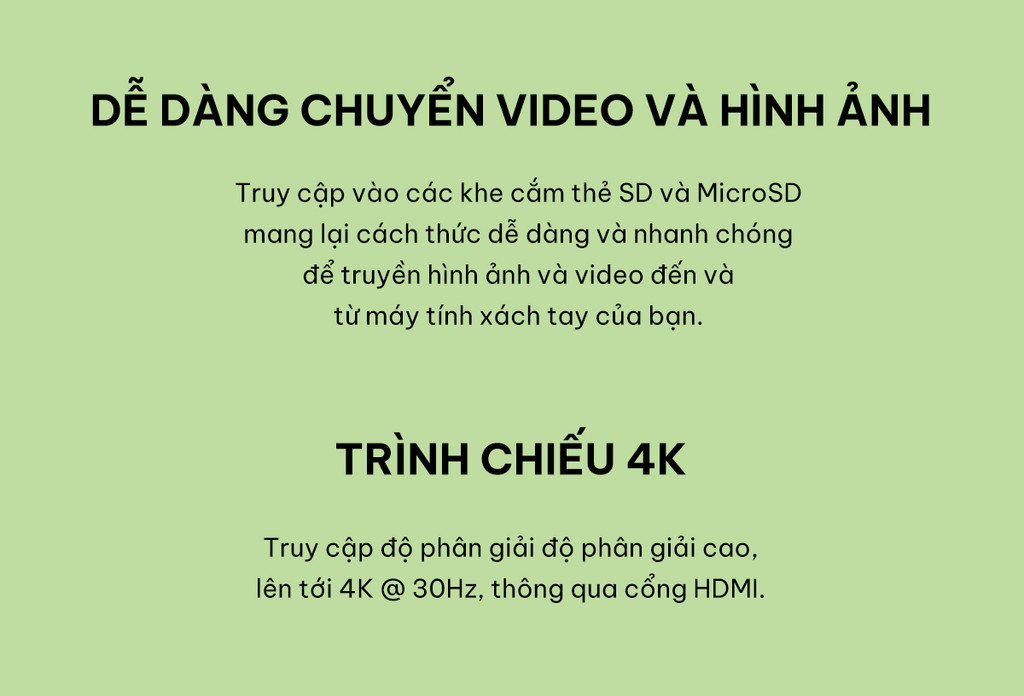 Kết nối máy tính xách tay với cổng HDMI, khe cắm SD và MicroSD cũng như 2 cổng USB-A thông qua một cổng USB-C duy nhất