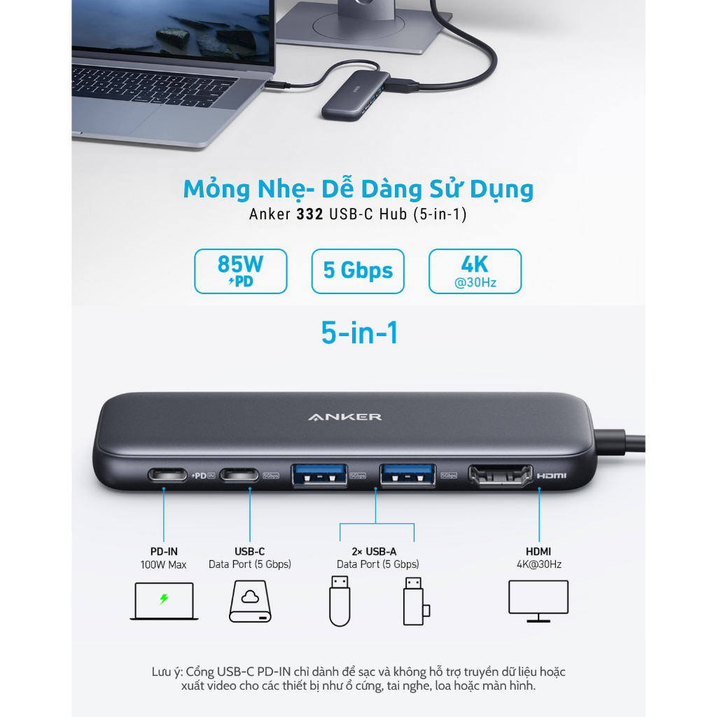 Hub chuyển đổi ANKER 332 USB-C 5in1 | HDMI 4K / USB-C 5 Gbps / 2*USB-A 5 Gbps / sạc PD input 100W - A8355