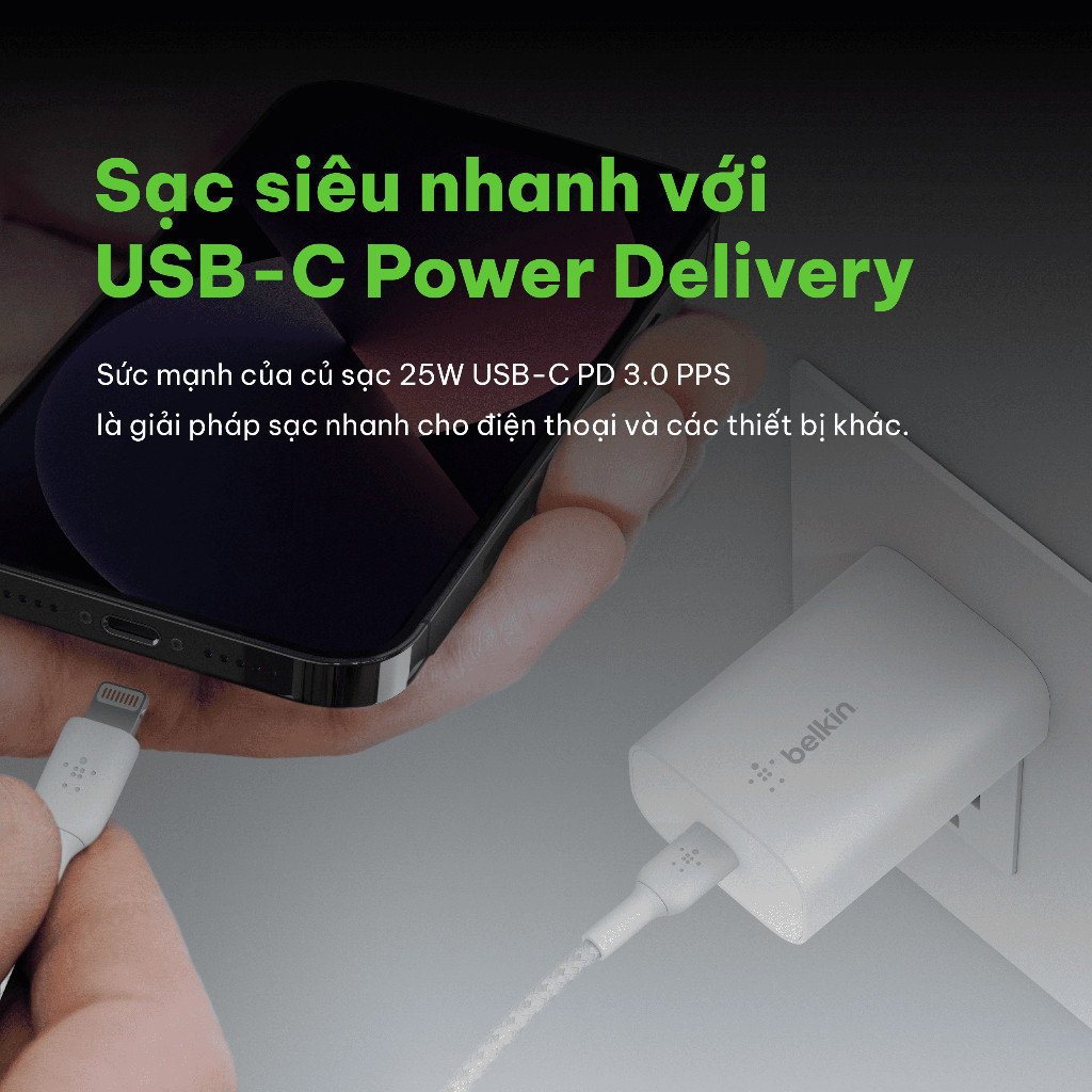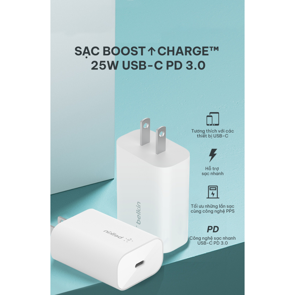 Củ sạc nhanh Belkin BOOST↑CHARGE™ 25W, chuẩn USB-C PD PPS, sạc nhanh an toàn cho thiết bị