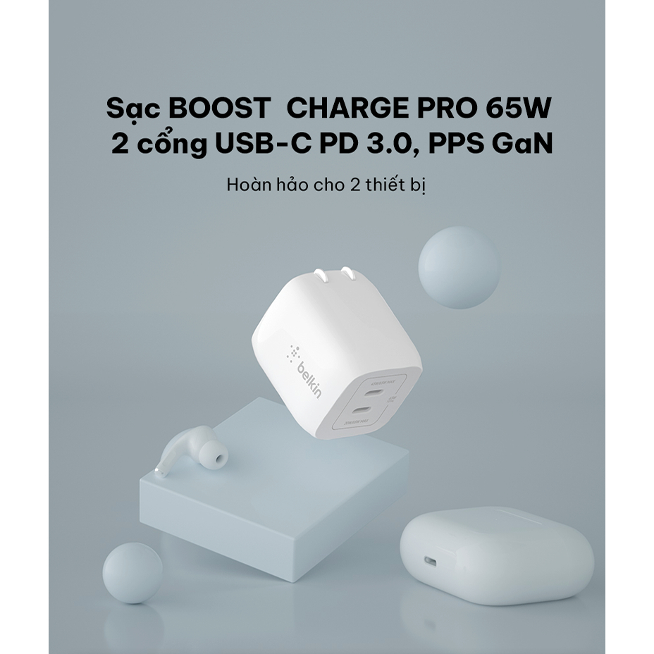 Củ sạc nhanh Belkin PRO GaN 65W | 2 cổng USB-C, Thiết kế nhỏ gọn, công nghệ tối ưu, An toàn cao