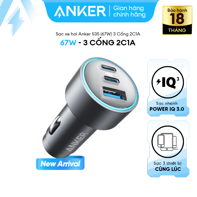 Tẩu sạc xe hơi Anker 535 (67W) 3 Cổng (hai cổng USB-C và một cổng USB-A)- A2731