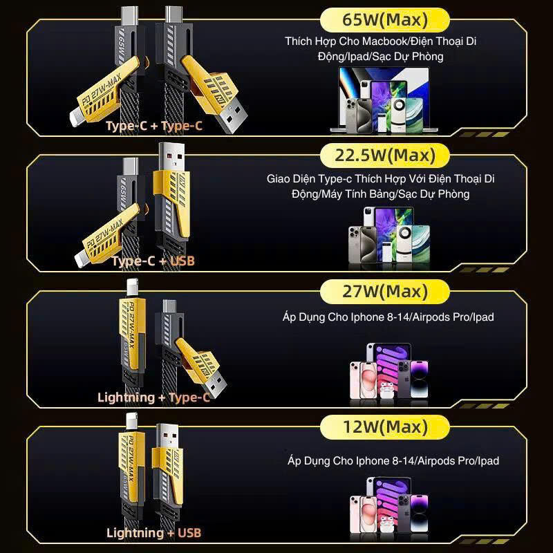 – Cáp sạc 4 đâu, hồ trợ USB A – Loại C, USB A – Sết, Loại