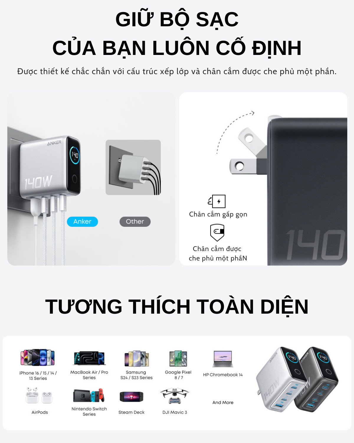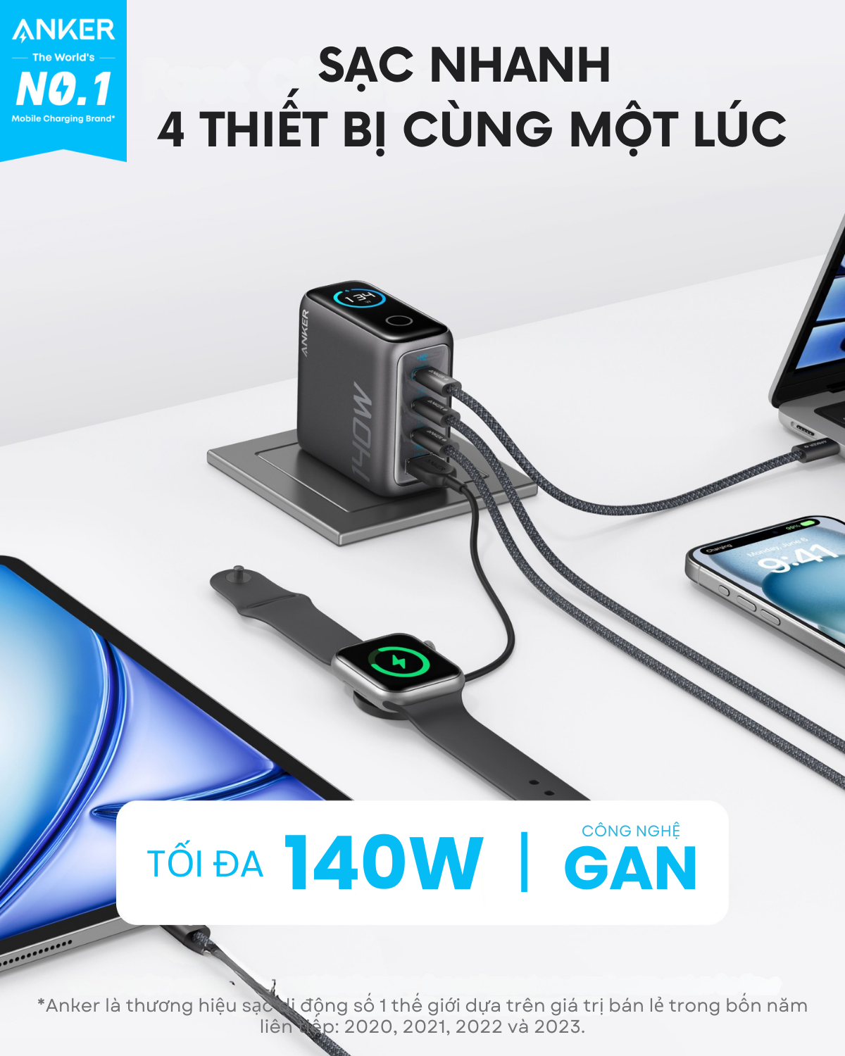 Tổng công suất tối đa 140W: Dễ dàng sạc đồng thời laptop, điện thoại và các thiết bị khác mà không làm giảm hiệu suất.