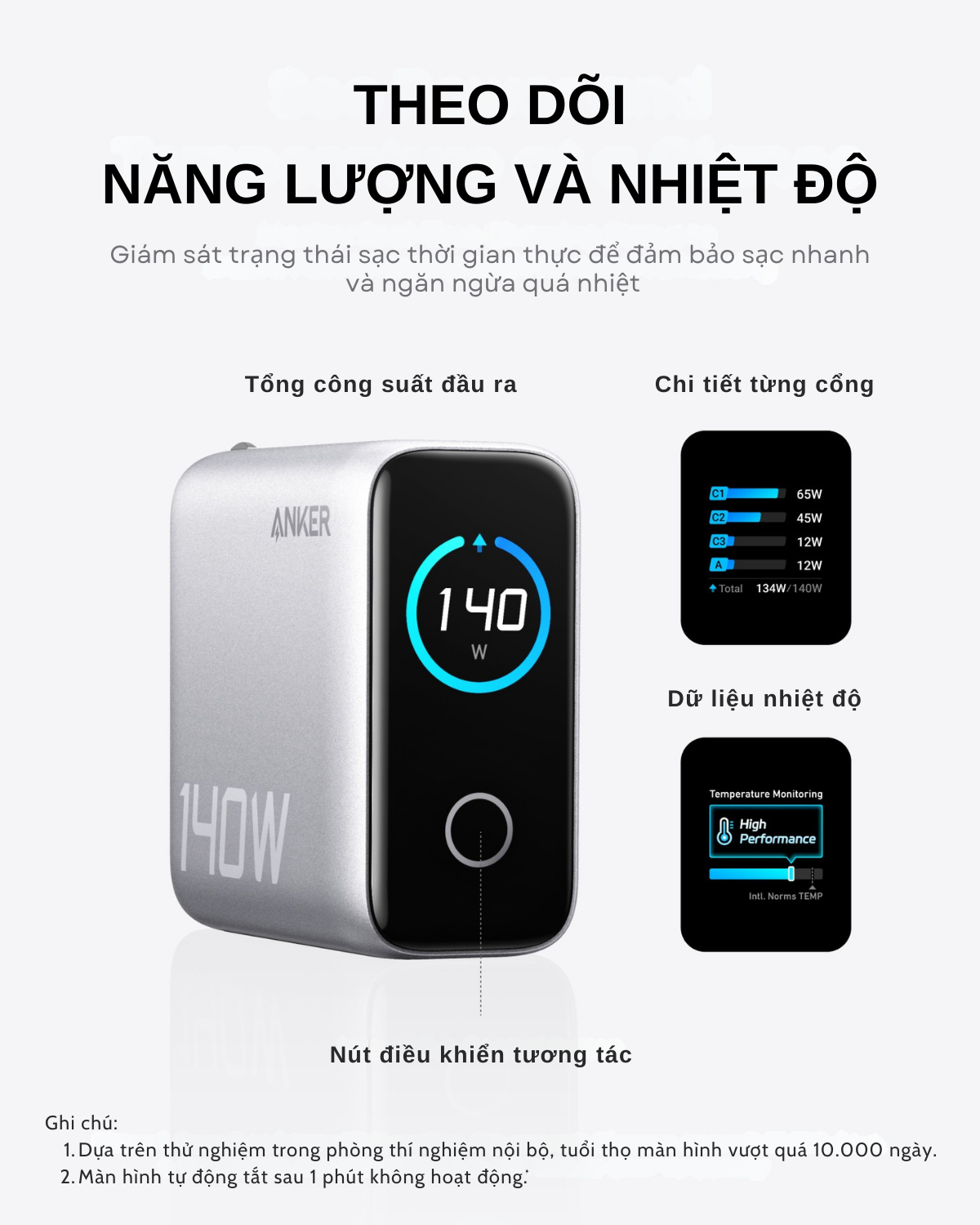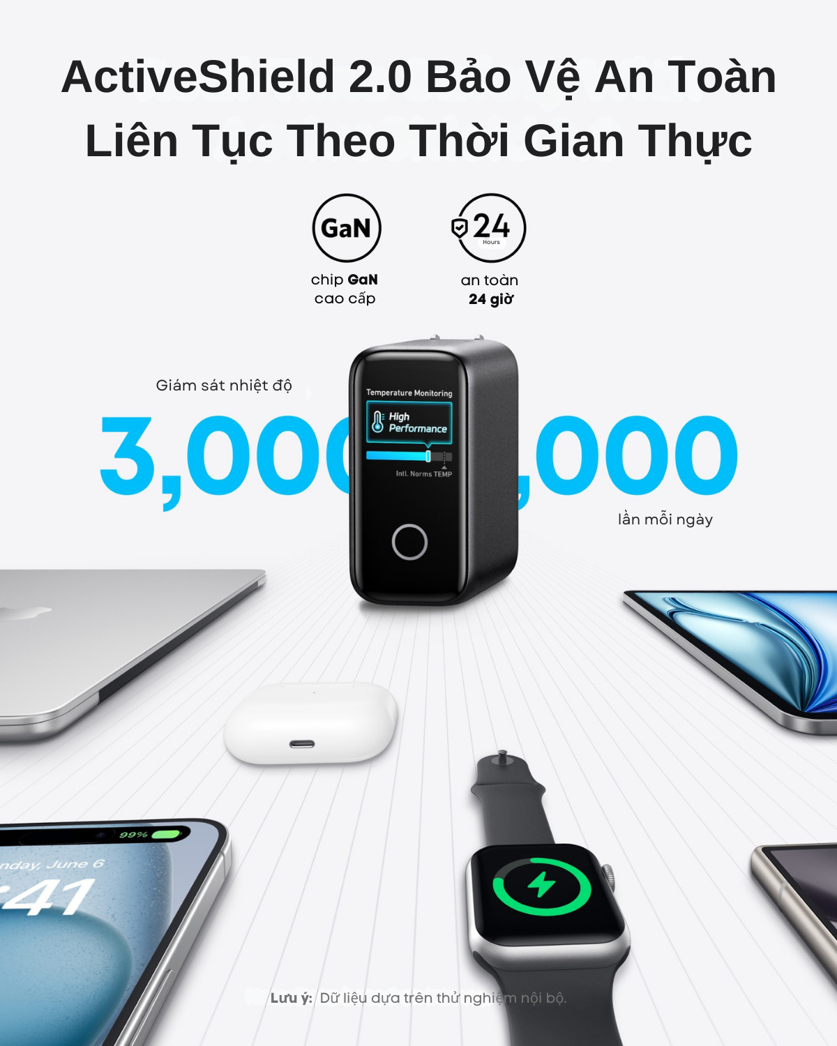 Cảnh báo nhiệt độ: Tích hợp cảm biến AI để hiển thị nhiệt độ hoạt động của bộ sạc, từ đó bảo vệ thiết bị khỏi tình trạng quá nhiệt.