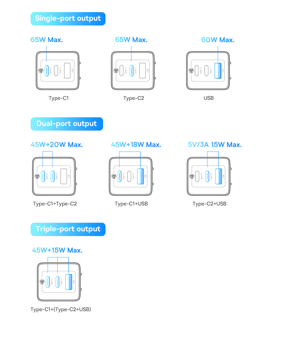 Type-C1 + Type-C2 + Đầu ra USB: 45W + 15W