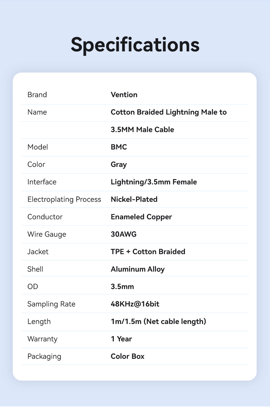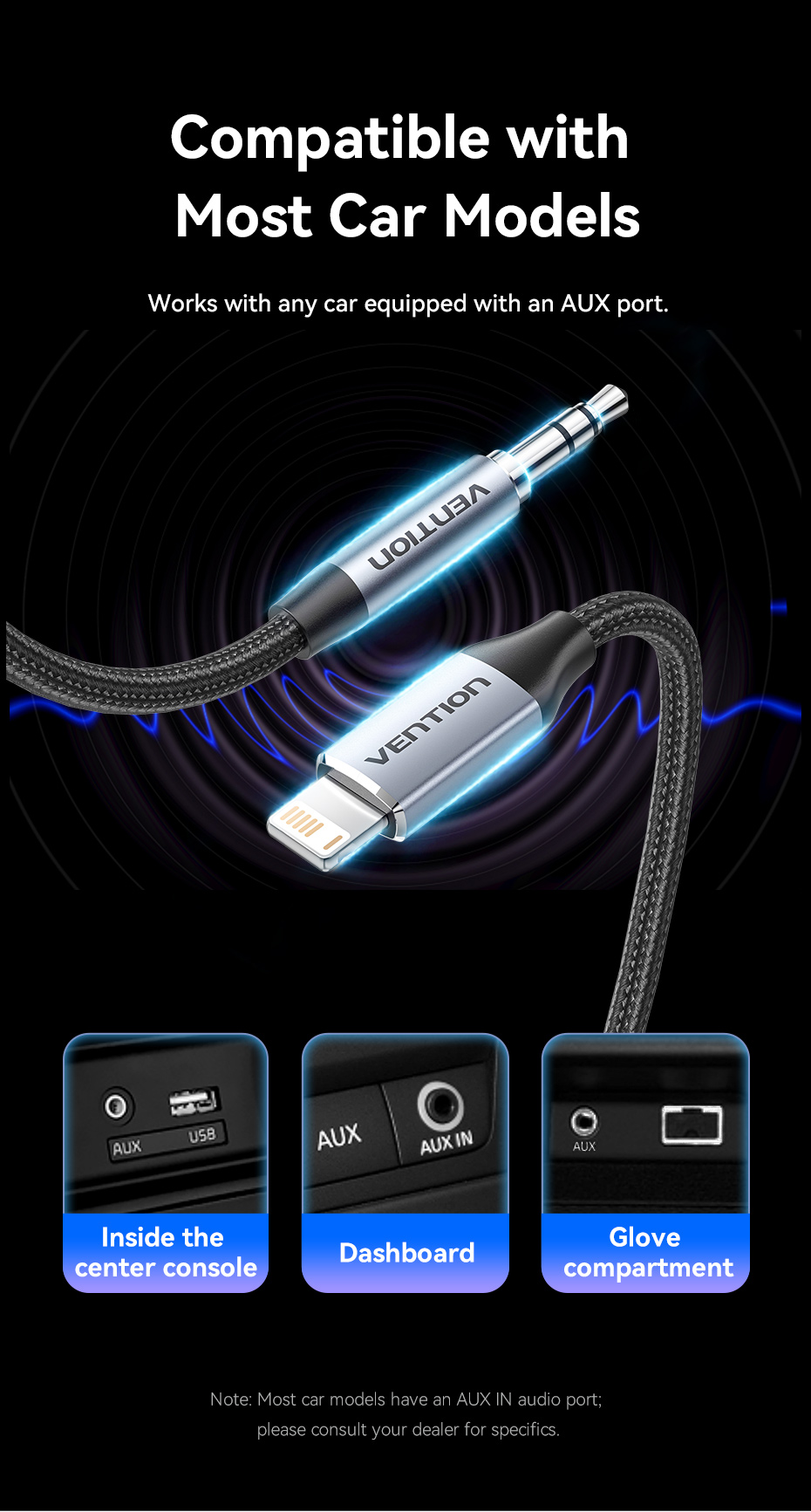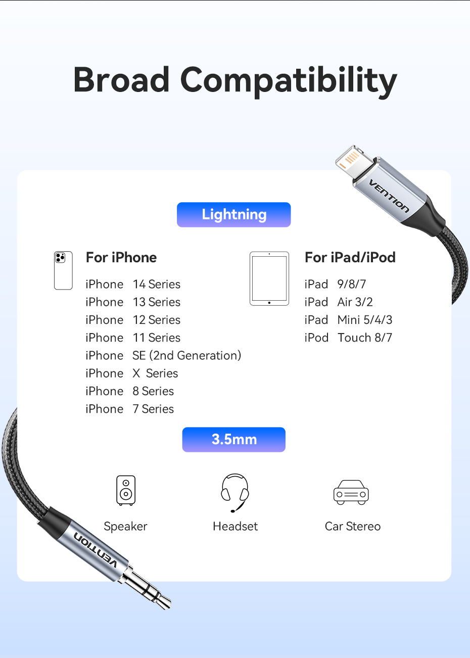 Cáp AUX Tai Nghe Vention Lightning to 3.5mm Cáp Chuyển Đổi âm Thanh Tương Thích Lighting Sang 3,5 mm Cho iPhone 7 – 14 Series