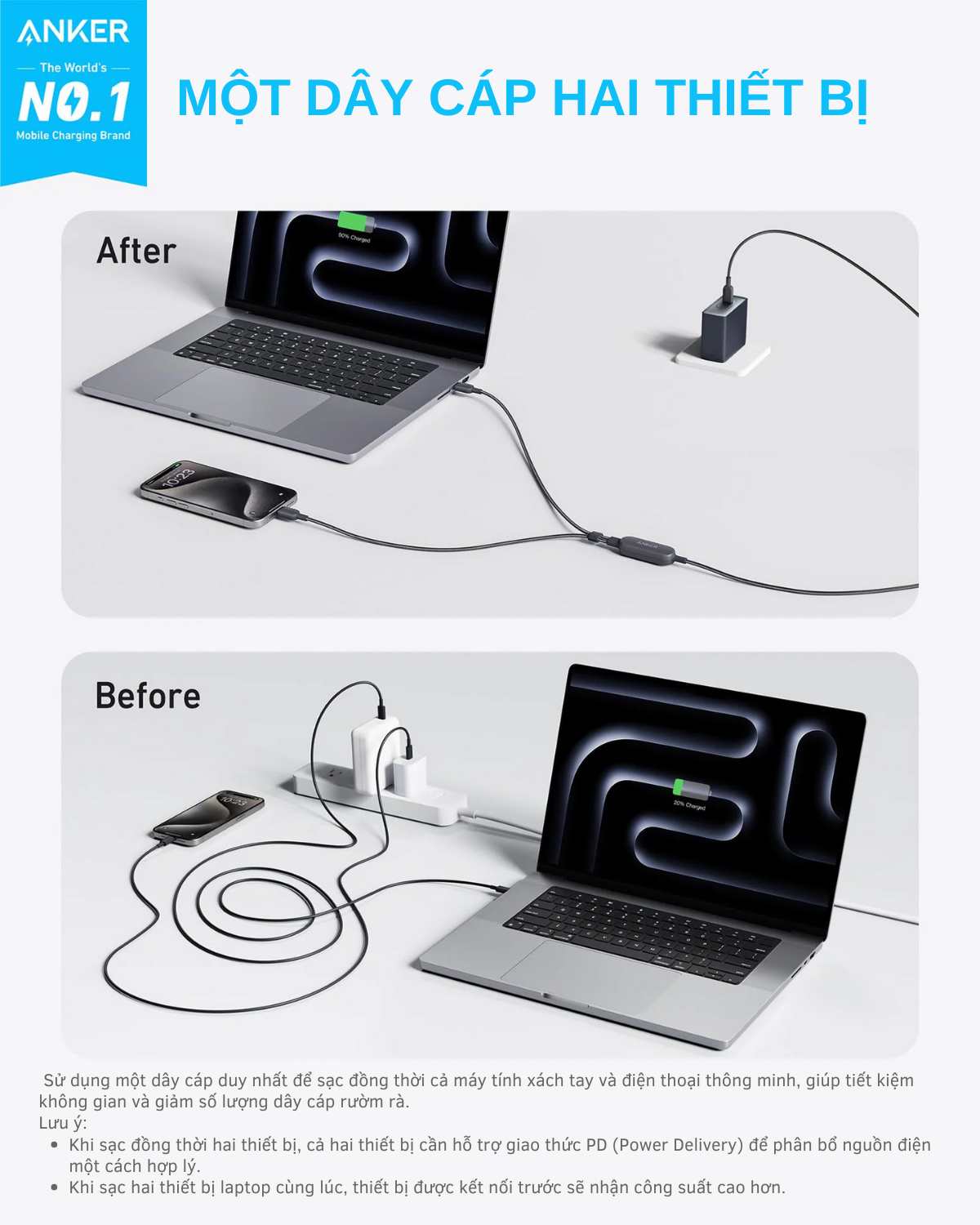 – Phân Phối Nguồn Điện: Khi sạc hai thiết bị cùng lúc, thiết bị kết nối trước sẽ được ưu tiên nhận công suất cao hơn.
