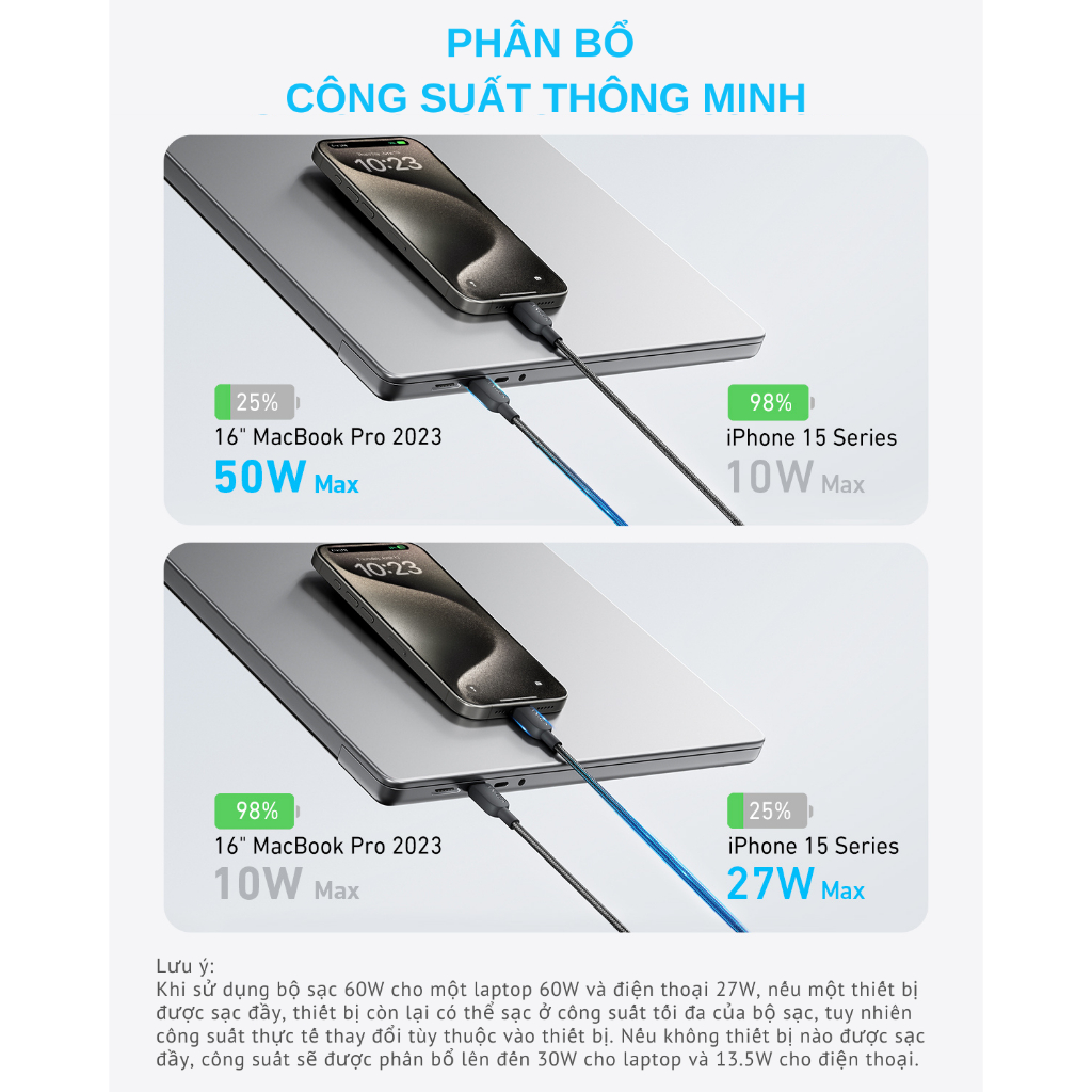 – Phân Phối Nguồn Điện: Khi sạc hai thiết bị cùng lúc, thiết bị kết nối trước sẽ được ưu tiên nhận công suất cao hơn.