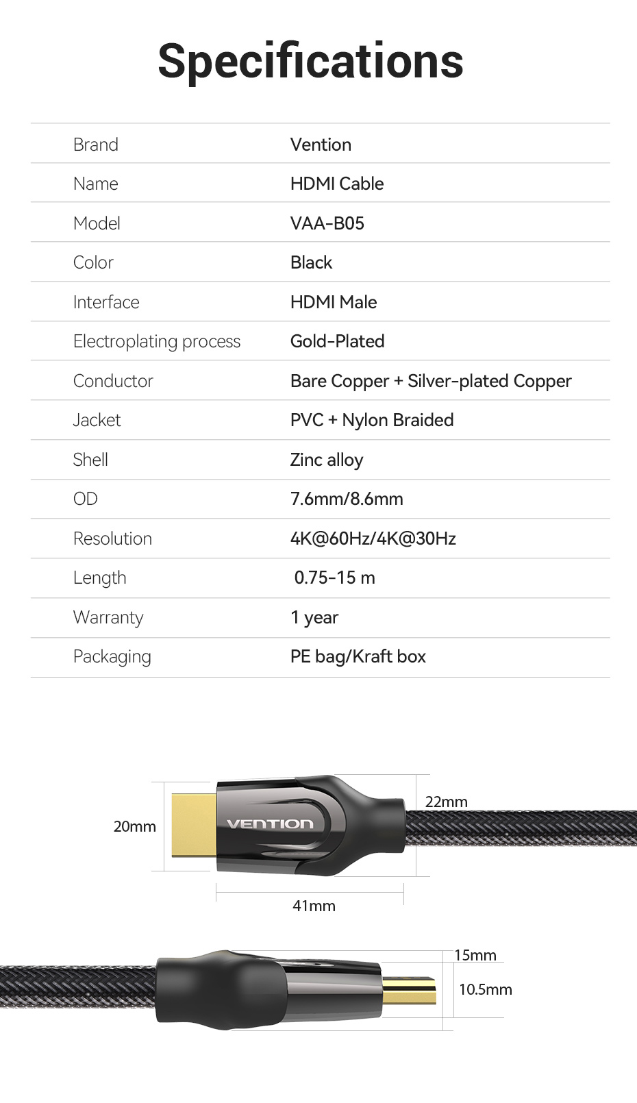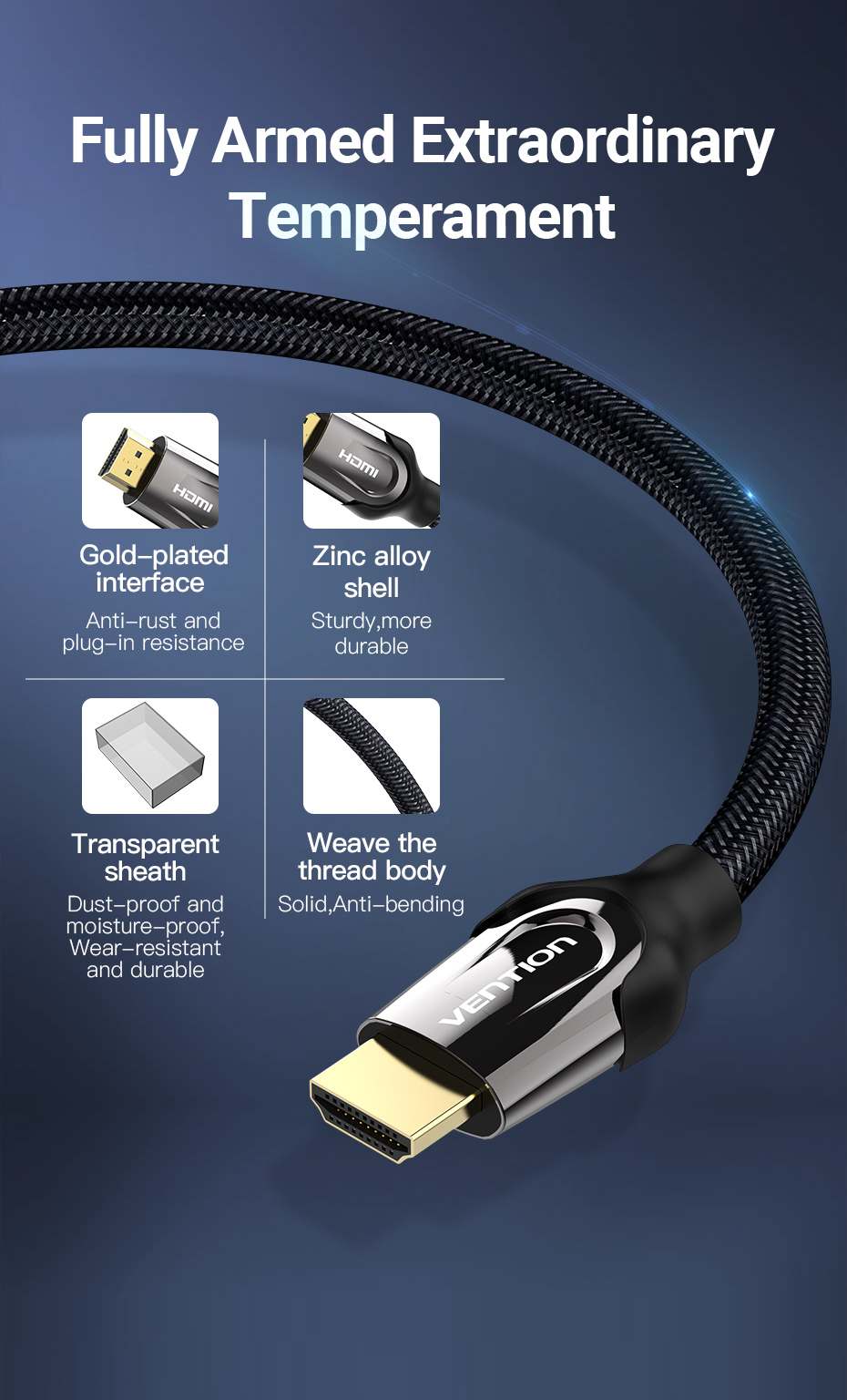 Cáp HDMI bện nylon và đầu nối kim loại hợp kim kẽm thanh lịch.