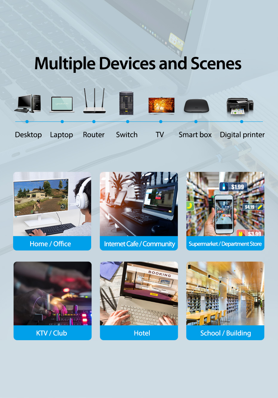 Mạng Gigabit Ethernet tương thích ngược với mạng cáp Cat 5E hoặc Cat 5, dây cáp mở rộng xoắn đôi Cat 6 cung cấp kết nối phổ biến cho các thành phần mạng như máy tính, máy in, bộ định tuyến, hộp công tắc, trình phát phương tiện mạng, NAS, điện thoại VoIP, thiết bị PoE, Hub, DSL, xBox, PS3, PS3, v.v.