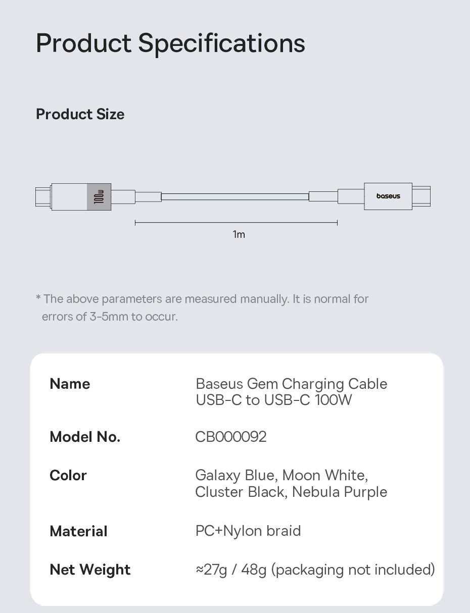 Tên: Cáp sạc đá quý Baseus USB-C sang USB-C PD 100W