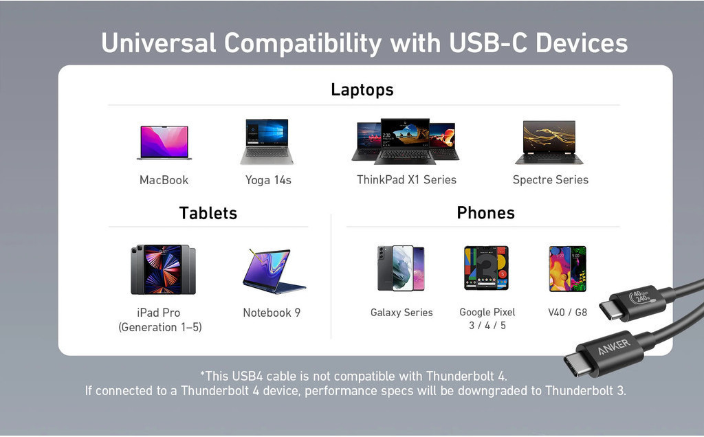 • Lưu ý: Cáp USB4 này không tương thích với Thunderbolt 4. Nếu được kết nối với thiết bị Thunderbolt 4, thông số hiệu suất sẽ bị hạ xuống Thunderbolt 3.