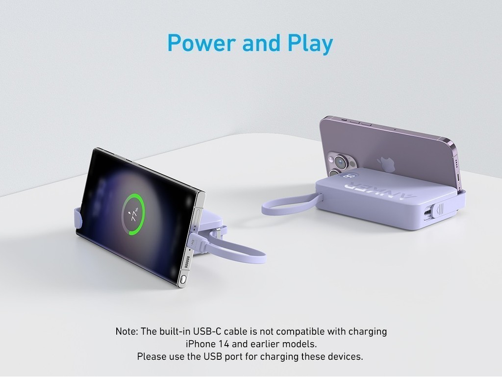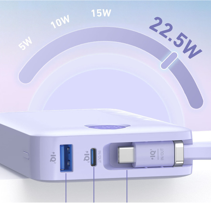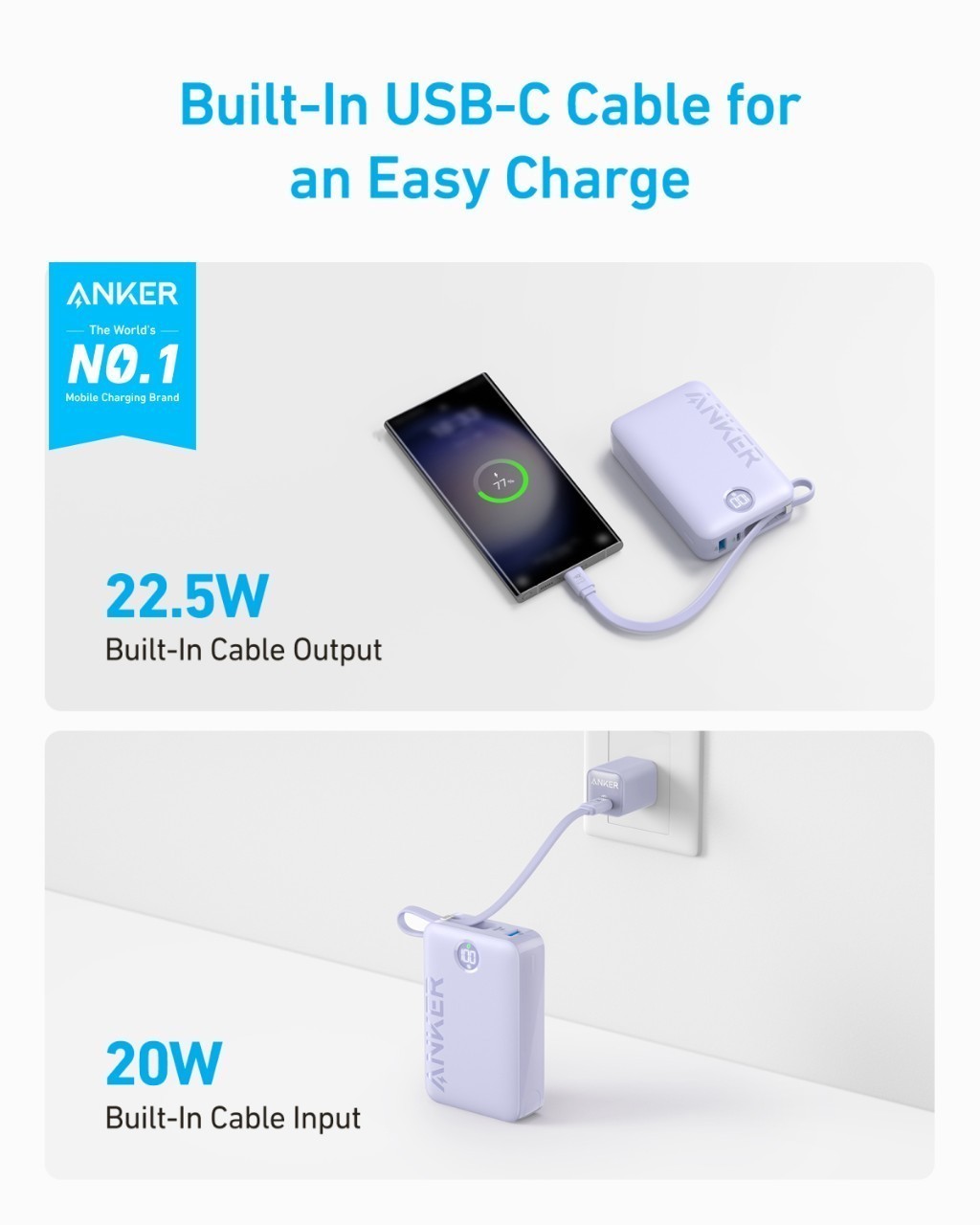 • Tận hưởng sự tiện lợi của cáp USB-C tích hợp, cung cấp công suất đầu ra 22,5W tốc độ cao để sạc dễ dàng khi đang di chuyển.
