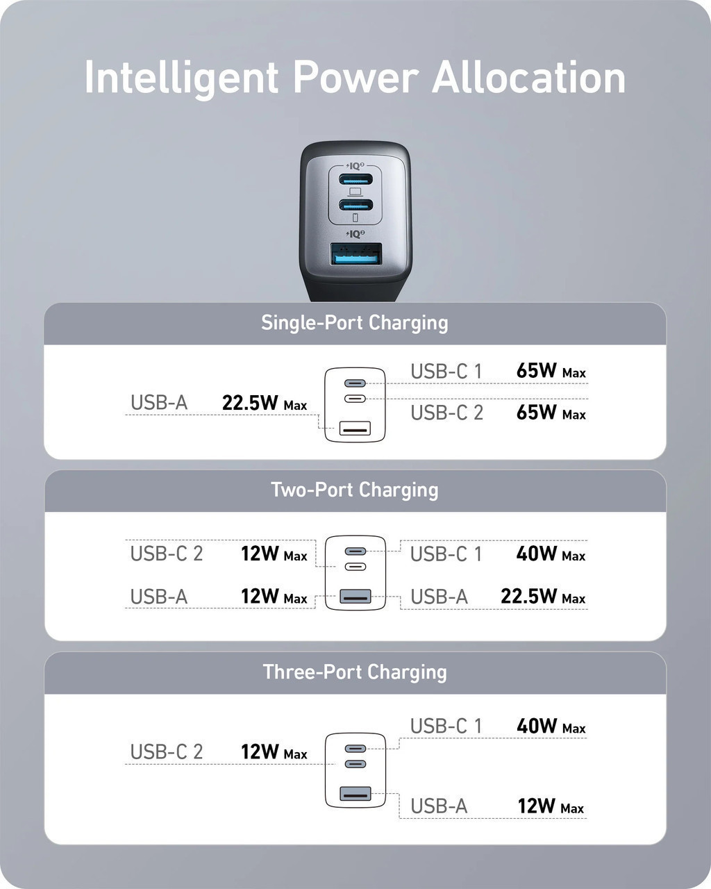 Single Port Output: USB-C 1 (65W Max) / USB-C 2 (65W Max) / USB-A (22.5W Max)