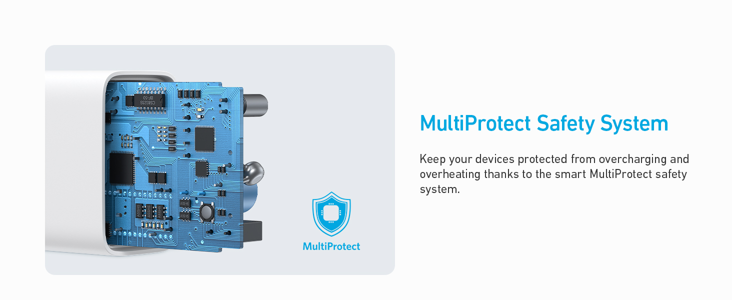 Được trang bị hệ thống an toàn MultiProtect độc quyền của Anker, giúp theo dõi nhiệt độ thông minh, bảo vệ chống quá dòng quá nhiệt, cung cấp khả năng bảo vệ toàn diện cho thiết bị của bạn, giúp bạn yên tâm khi sạc.