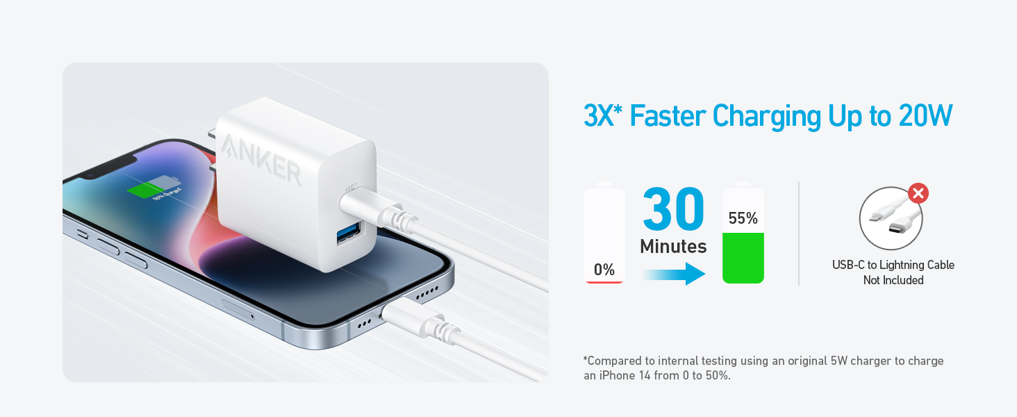 Tận hưởng khả năng sạc nhanh chóng với công suất lên đến 20W cho iPhone, điện thoại Samsung và các thiết bị khác của bạn. Giúp tăng tốc sạc iPhone 14 từ 0% lên 55% chỉ trong 30 phút, sạc nhanh gấp 3x so với củ sạc 5W thông thường.