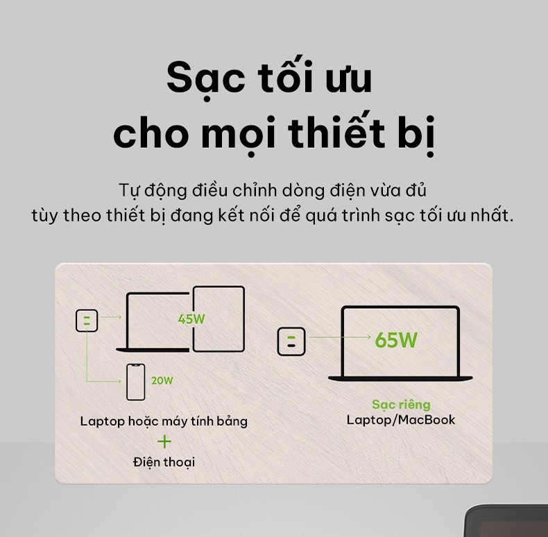 Để sạc laptop/máy tính bảng: dùng 1 cổng USB-C đơn để đạt công suất tối đa 65W.