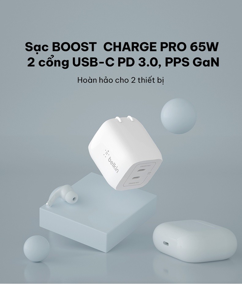 Củ sạc nhanh Belkin PRO GaN 65W | 2 cổng USB-C, Thiết kế nhỏ gọn, công nghệ tối ưu, An toàn cao