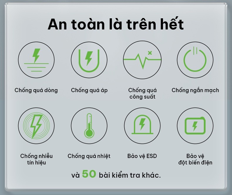 An toàn vượt trội: bảo vệ quá áp, quá nhiệt, ngắn mạch, tự ngắt khi đầy.
