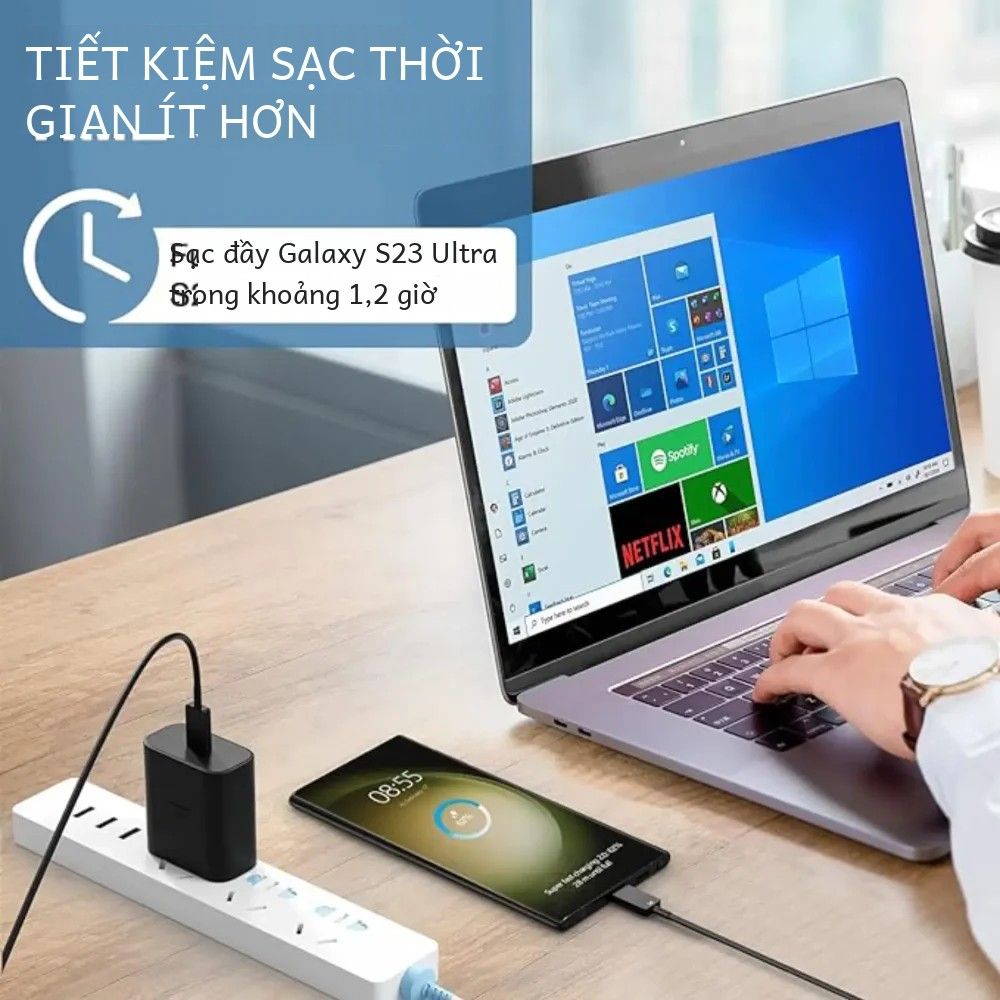 Trải nghiệm sạc nhanh với bộ sạc USB C 45W, đảm bảo thiết bị Samsung của bạn được cấp nguồn nhanh chóng.