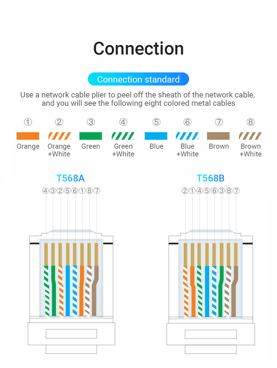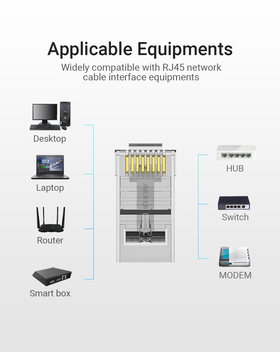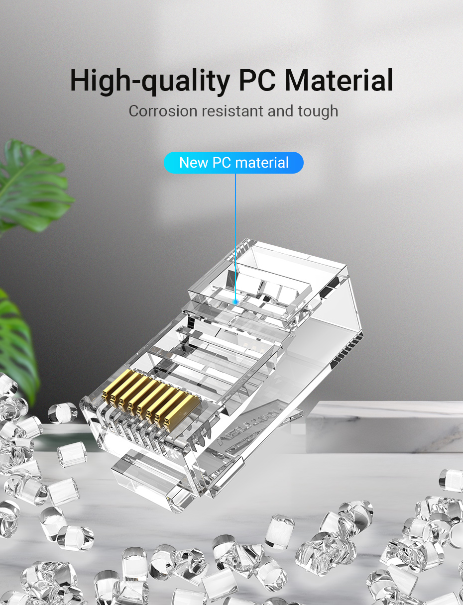 Phích cắm đầu nối uốn RJ45 lý tưởng cho bảo mật và cài đặt mạng lên đến 100 / 1000 Mbps.
