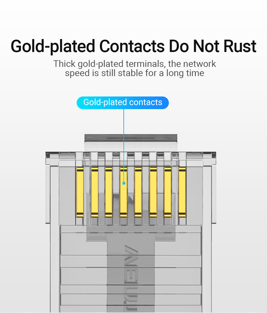 Các điểm tiếp xúc mạ vàng cải thiện hiệu suất tín hiệu, cung cấp hiệu suất đáng tin cậy cho mạng được xếp hạng Gigabit Ethernet.