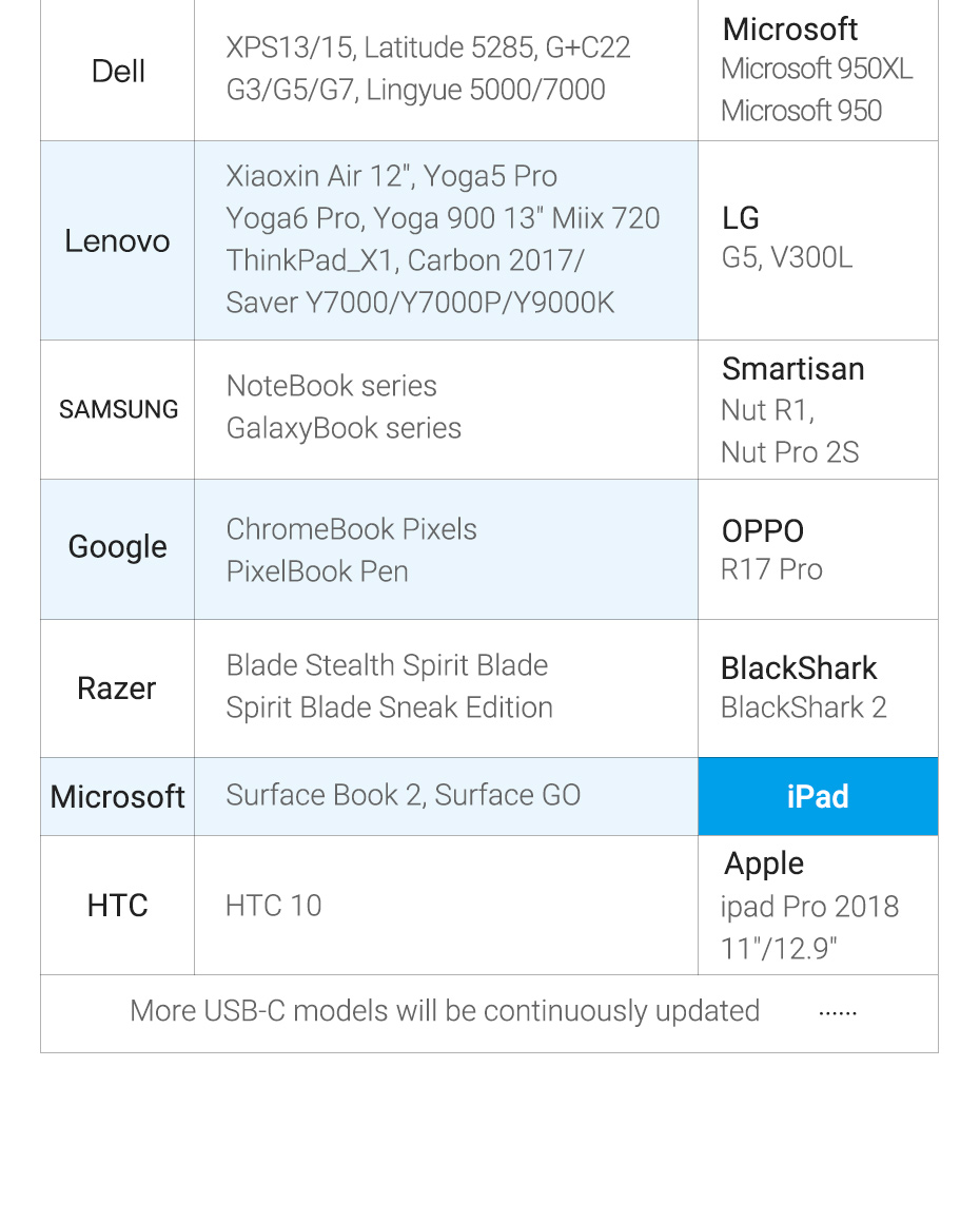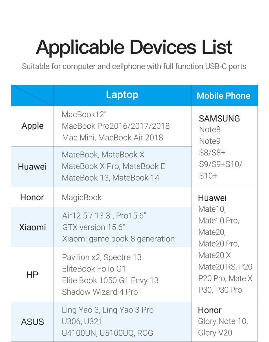 Hoạt động với máy tính cổng USB Type C và Thunderbolt 3 với ChromeBook Pixel, Surface Book 2 / GO, Dell XPS 15 9360, XPS 13-9350-R1609 13.3 “. Điện thoại thông minh có cổng USB C chỉ hỗ trợ Samsung Galaxy Note 9 / Note 8 / S10 / S10 Plus / S9 / S9 Plus / S8 / S8 Plus, HTC U11, Huawei Mate 10 / P20 / Pro v.v …