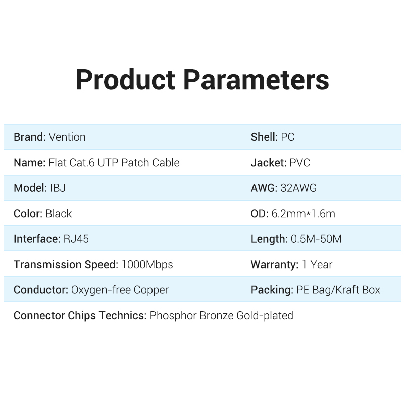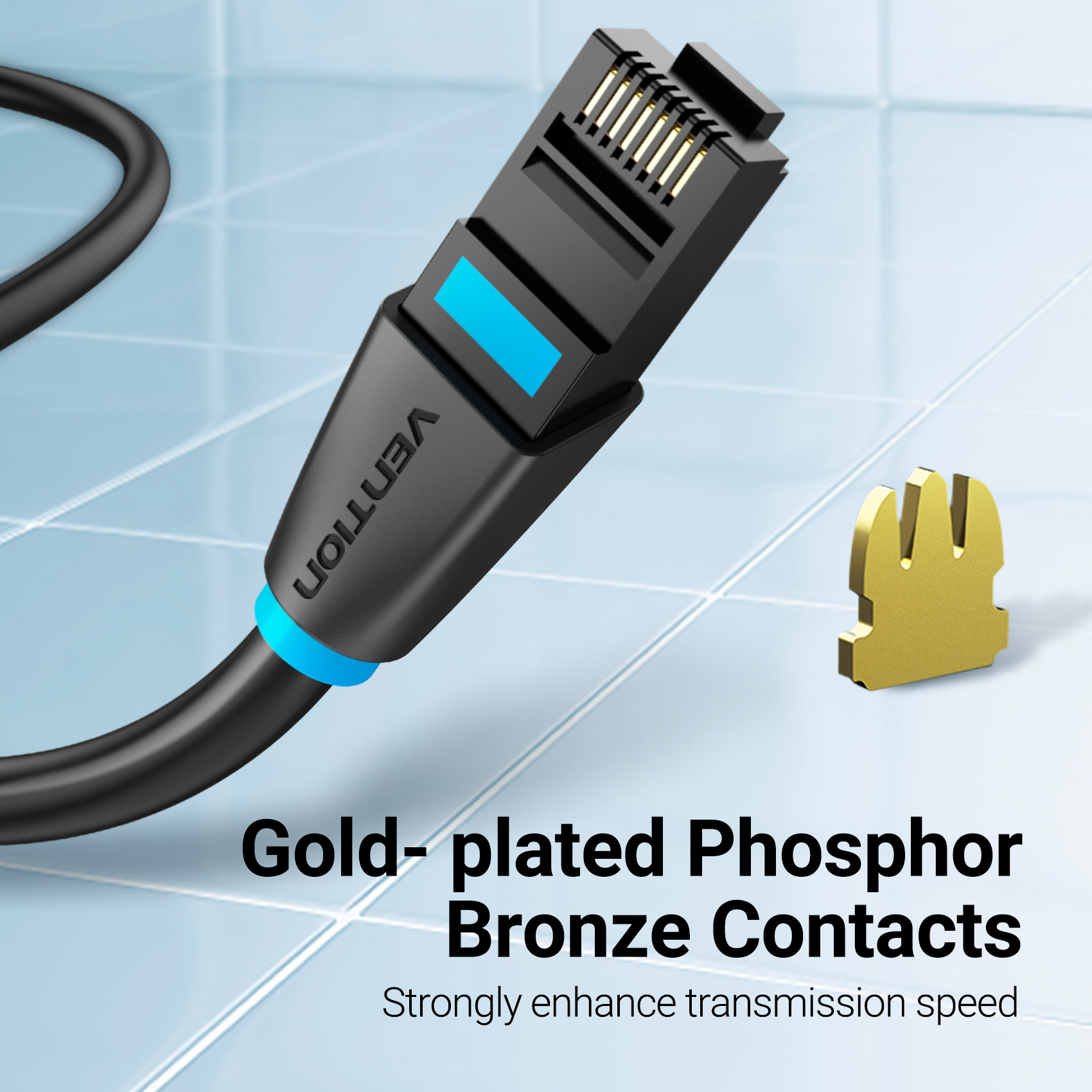 Cáp nối VENTION Cat.6 linh hoạt có lớp vỏ PVC bên ngoài bền để bảo vệ và các đầu nối RJ45 được mạ vàng để truyền dữ liệu chính xác và kết nối không bị ăn mòn.