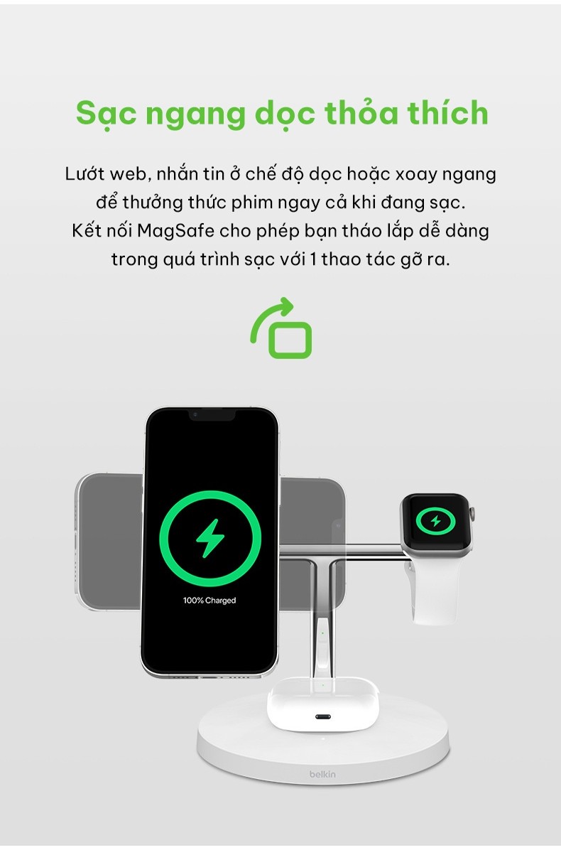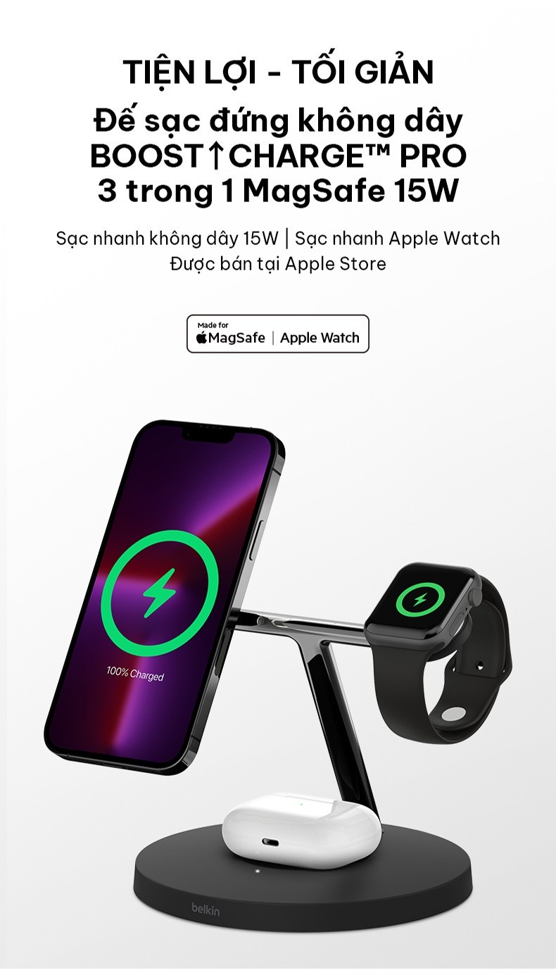 Đế sạc không dây 3 trong 1 BOOST↑CHARGE™ PRO Belkin MagSafe 15W (tương thích iPhone 15)