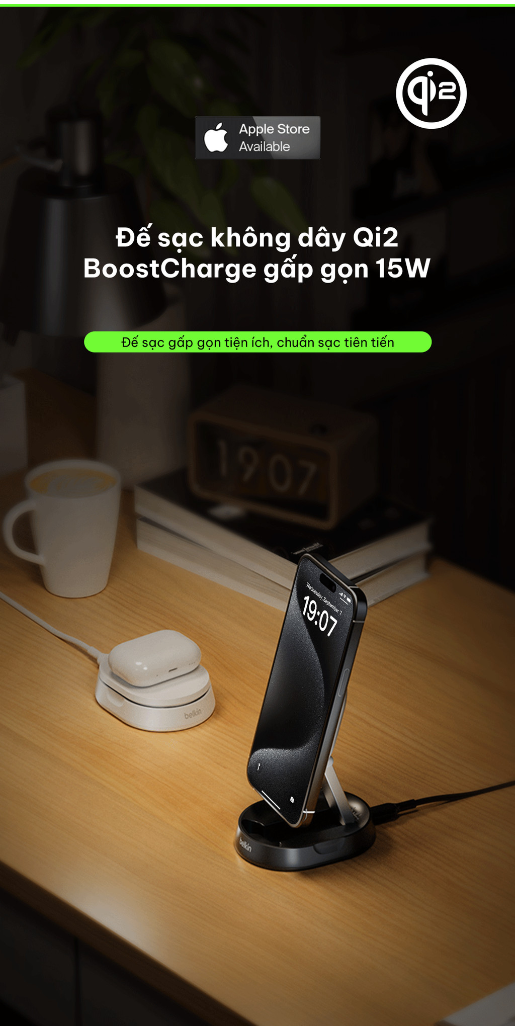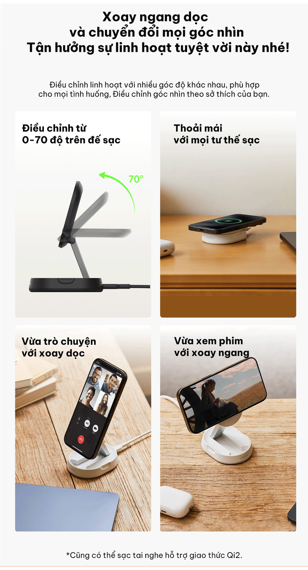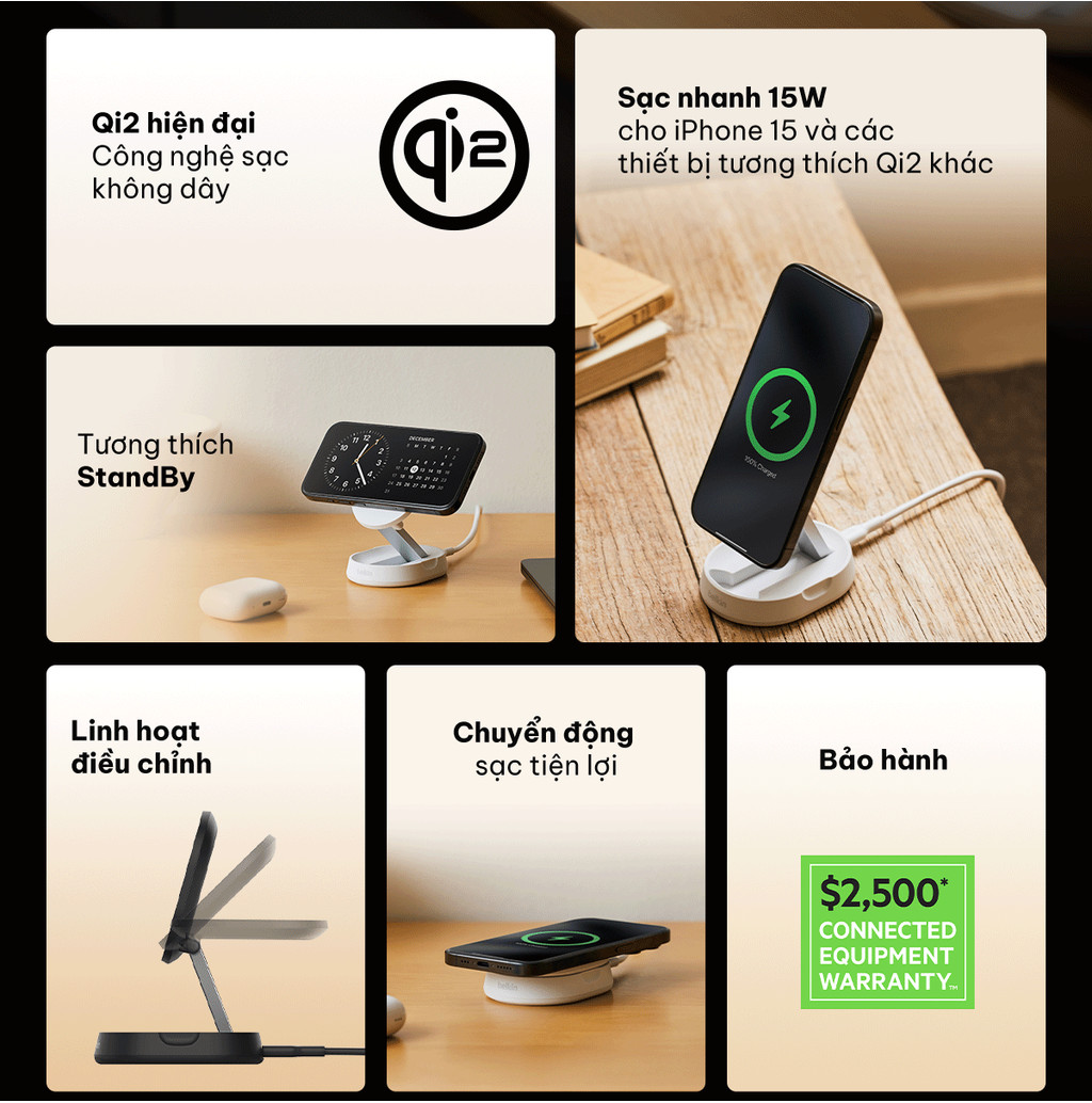 Sạc nhanh iPhone hoặc các thiết bị tương thích Qi2 khác với tốc độ lên đến 15W. Công nghệ Qi2 giúp tối ưu hóa việc sử dụng năng lượng và bảo vệ tuổi thọ pin của thiết bị. Sản phẩm này có đế sạc có thể điều chỉnh độ nghiêng để phù hợp với cả hai chế độ đặt và dựng. Người dùng Apple có thể tận dụng tính năng tương thích với Chế độ Standby.