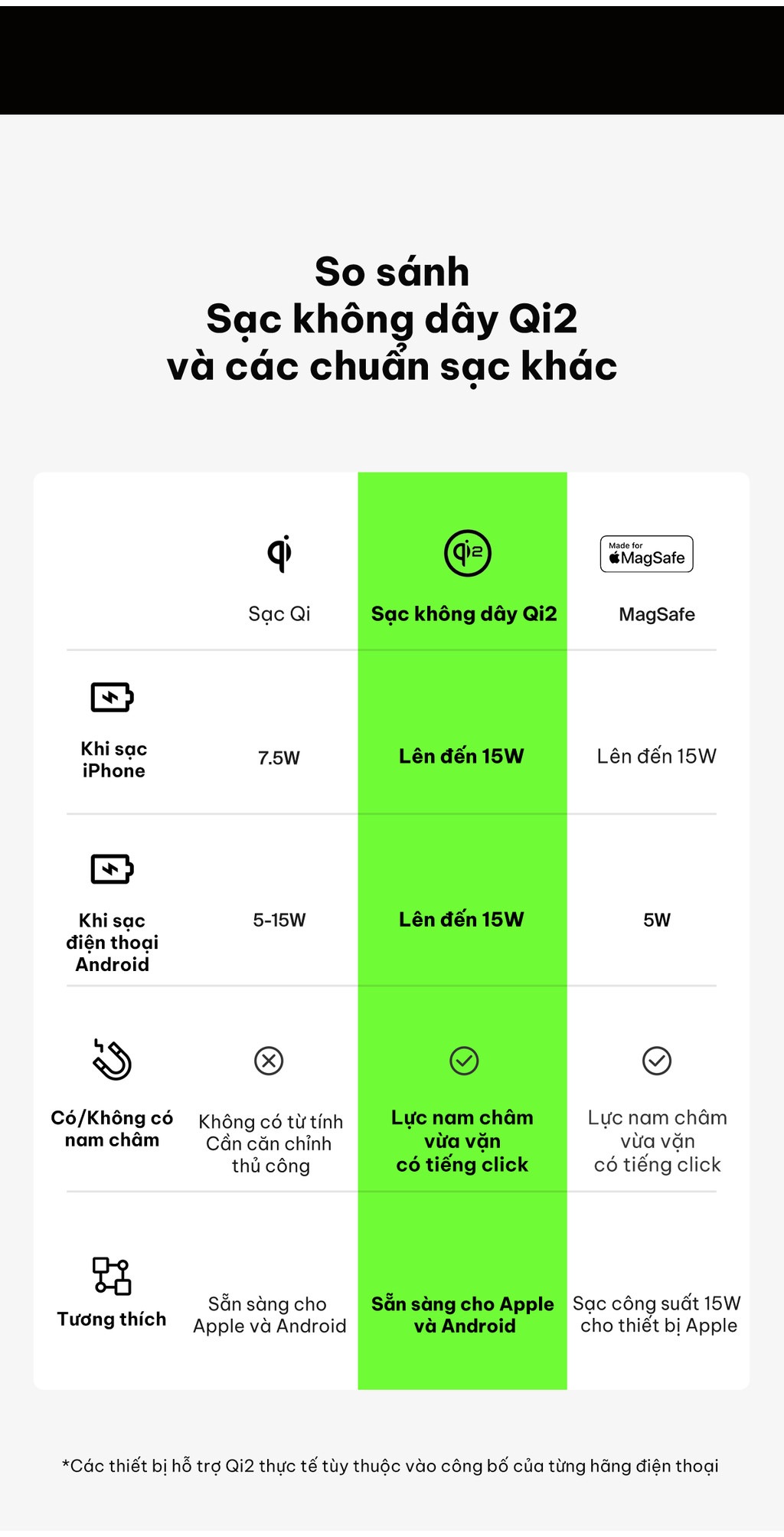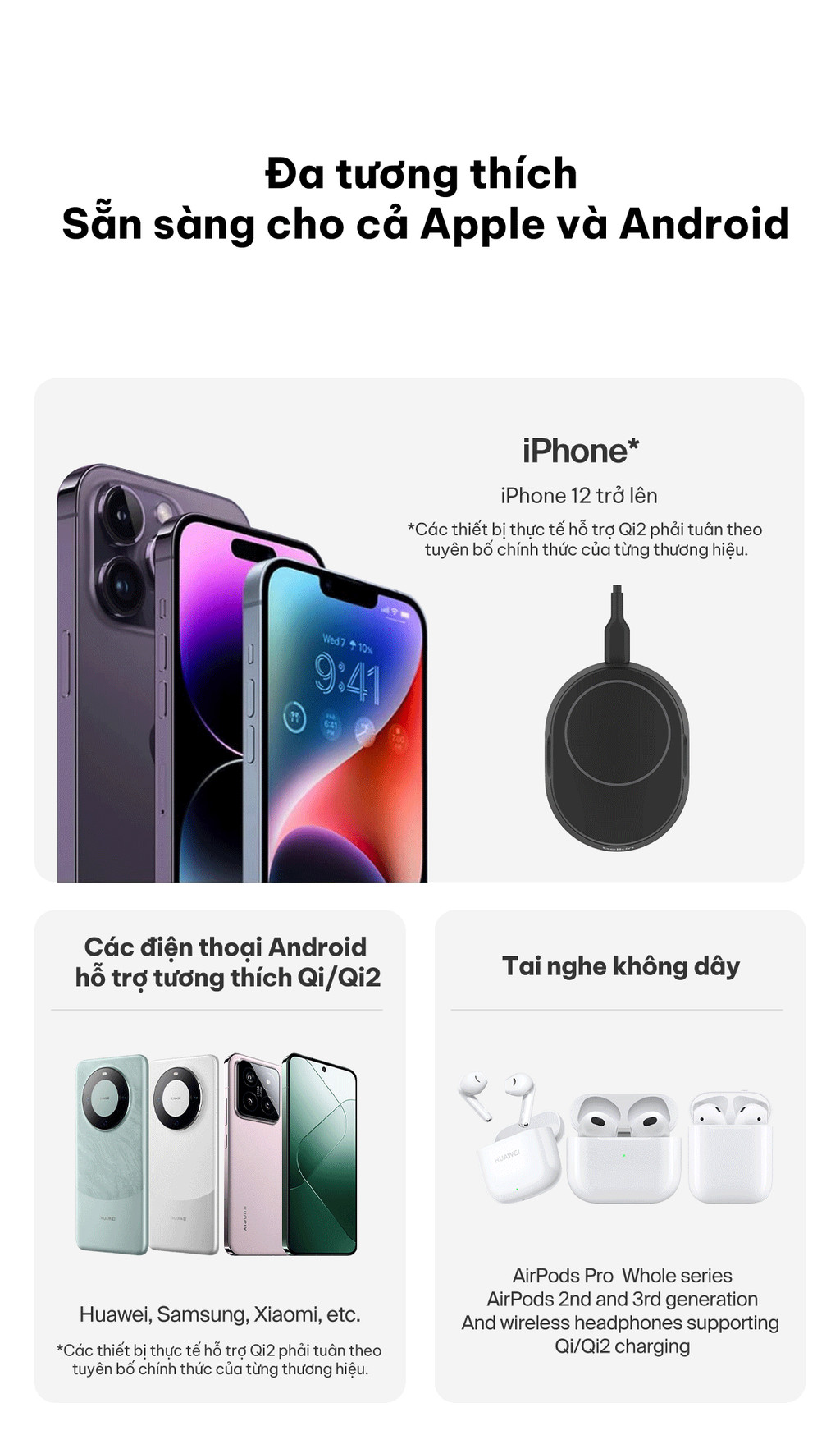 Khả năng tương thích rộng rãi hỗ trợ sạc nhanh không dây 15W cho các thiết bị tương thích Qi2, bao gồm cả iPhone. Lưu ý: iPhone 12 mini và iPhone 13 mini chỉ sạc được với công suất tối đa 12W.