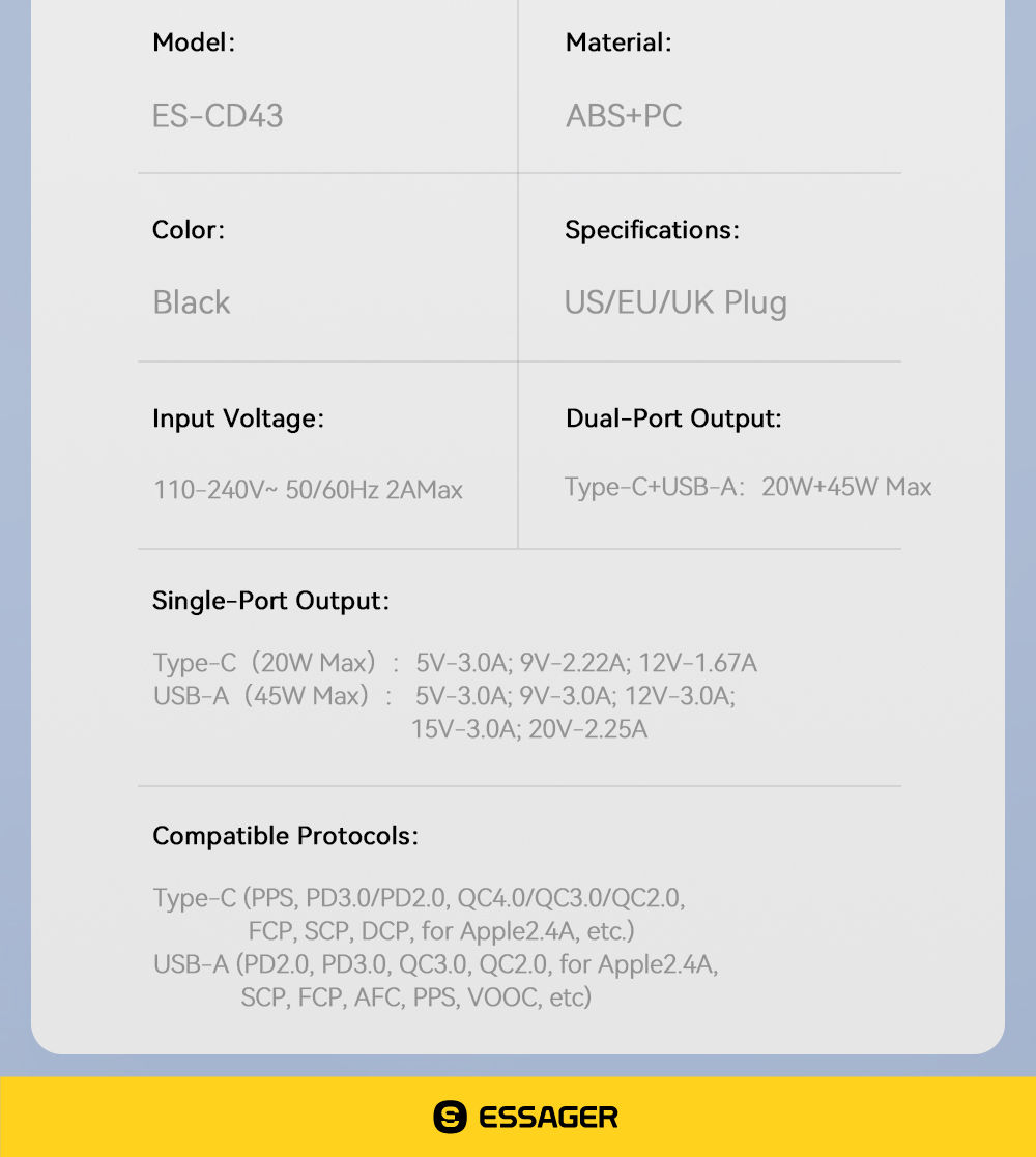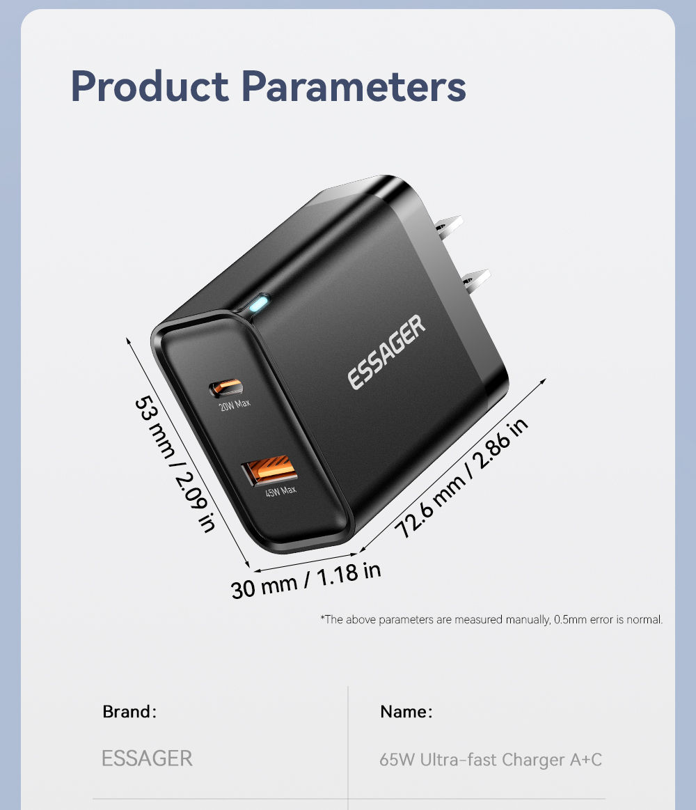 Thương hiệu: essagerTên: Aoyun 65W siêu lấp lánh sạc A + CMô hình: ES-CD43Điện áp đầu vào: 100V-240VKích thước sản phẩm: 56.8mm * 53mm * 30mm ± 1mmTrọng lượng tịnh: 89gVật chất: ABS + PC