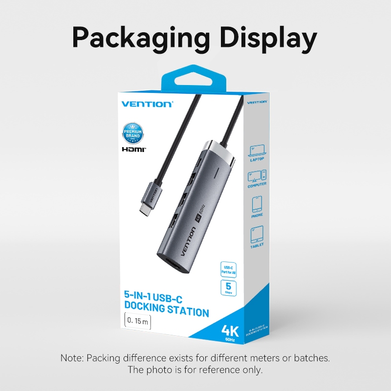 Hub USB C Vention 5 trong 1 cổng với 4k 60hz 5Gbps PD100w C sang HDMI USB 3.0 cho máy tính xách tay