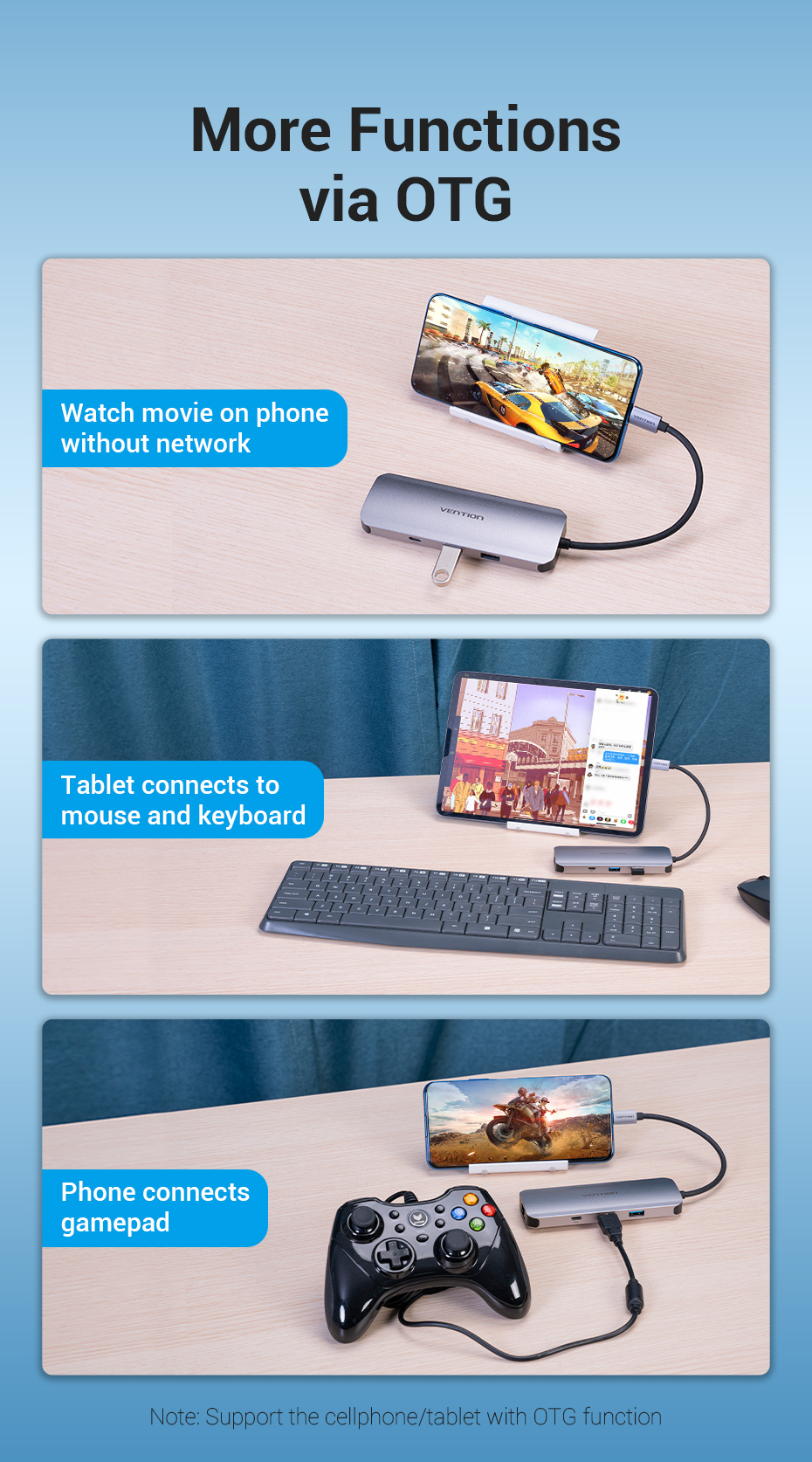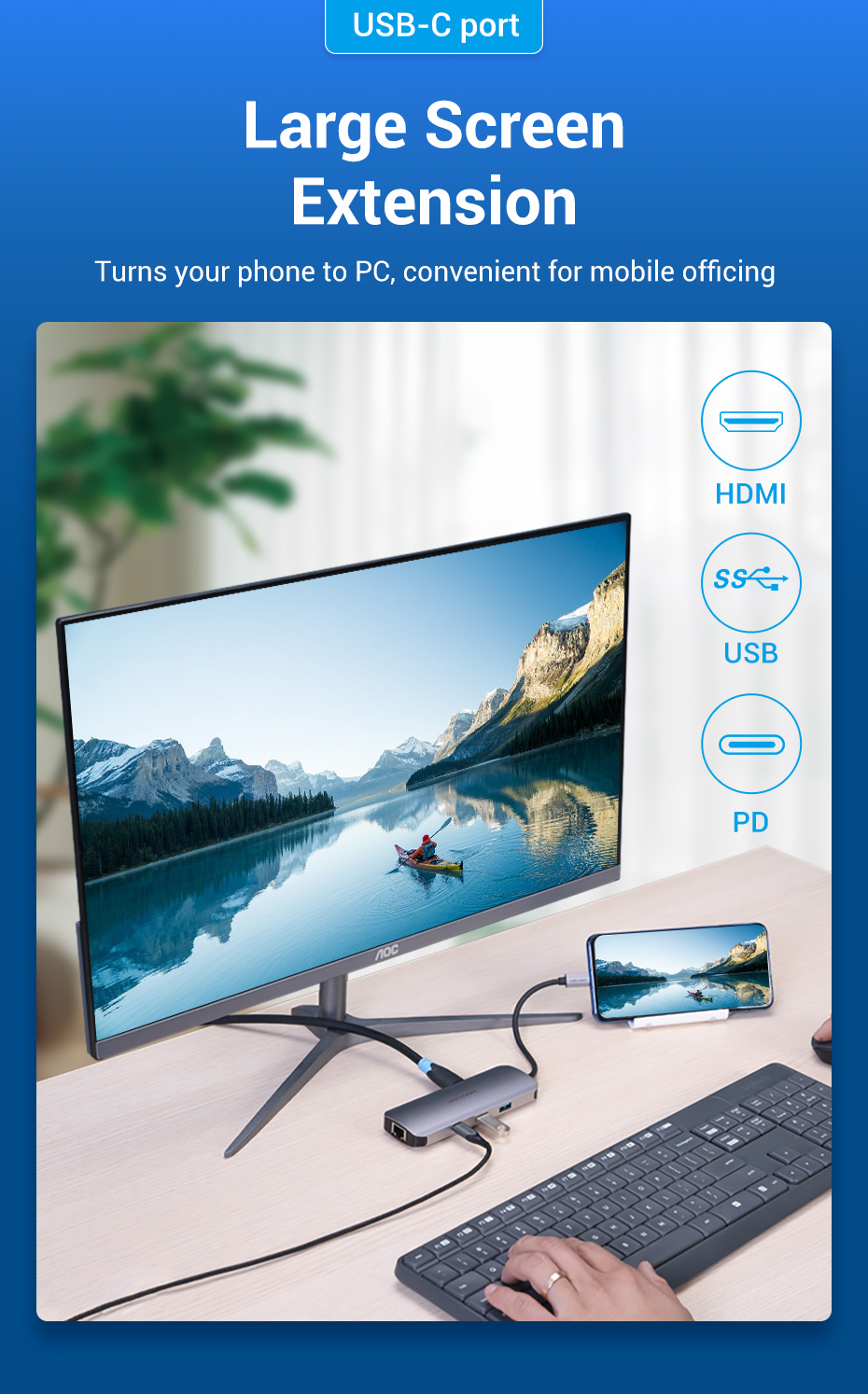 (5)7 in 1 (PD100W):HDMI (4K30HZ)+TF/SD slot+USB3.0 * 3+ PD (100W)