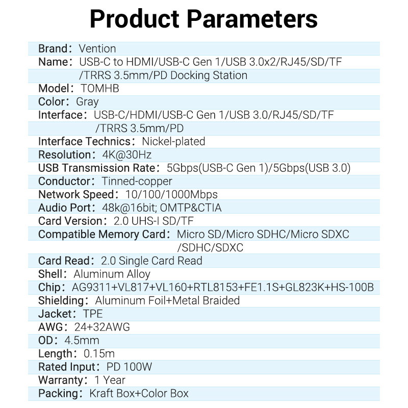 (4)8 in 1(PD100W):HDMI (4K30HZ) + RJ45 (1000Mbps) +TF/SD slot+ USB3.0 * 3 + PD (100W)