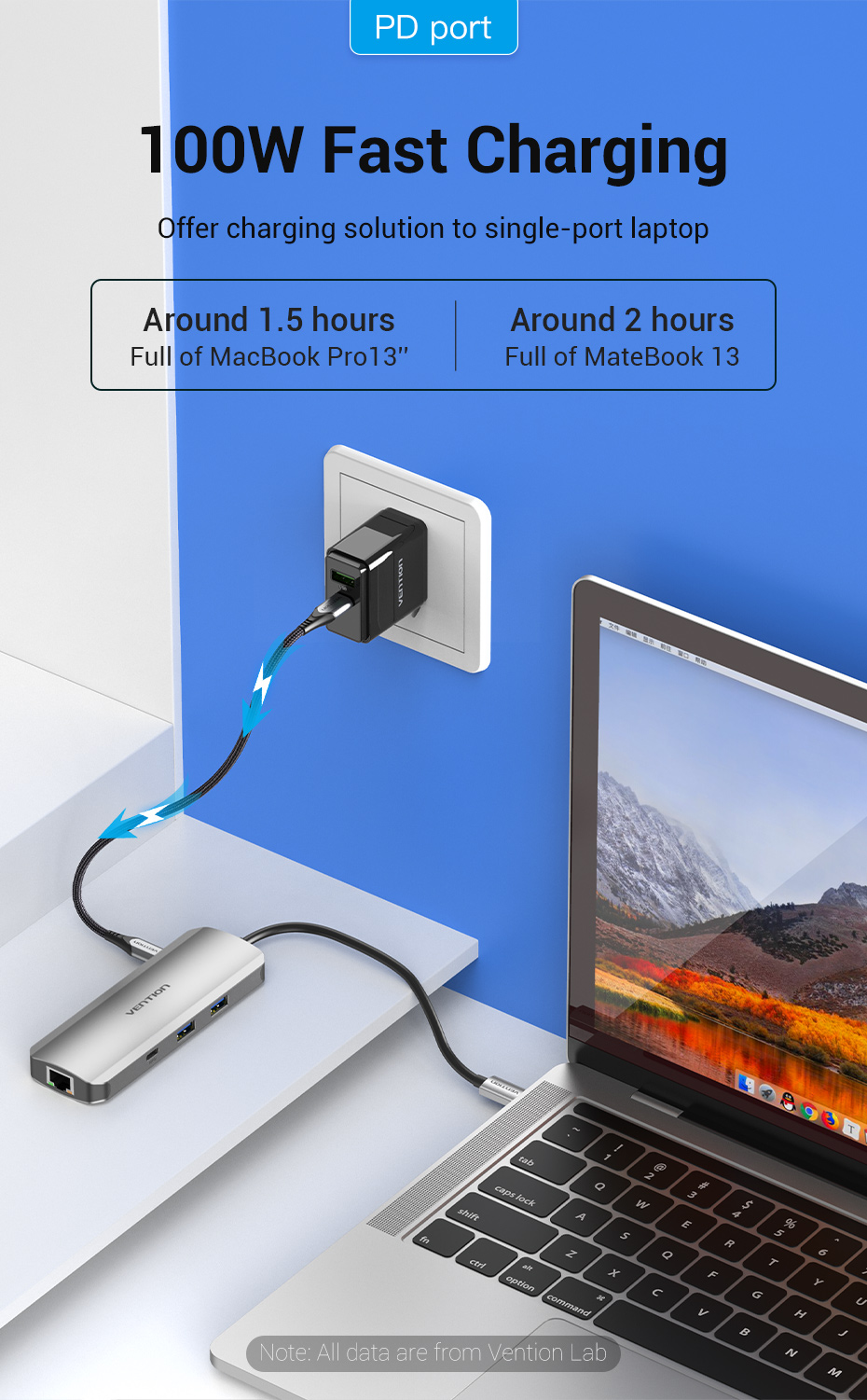Hỗ trợ sạc PD 3.0 ở mức tối đa 20V 3A, cổng cái chuyển tiếp Type-C này có thể nhanh chóng sạc Macbook mới hoặc các thiết bị USB-C khác dựa trên giao thức sạc PD cho nguồn điện.