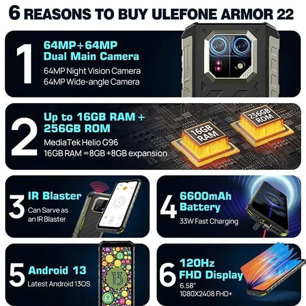 máy pda Ulefone Armor 22 | Flagship Ram 16gb + 256gb | Sát Thủ Nhìn Đêm 64mp + Ir Leds