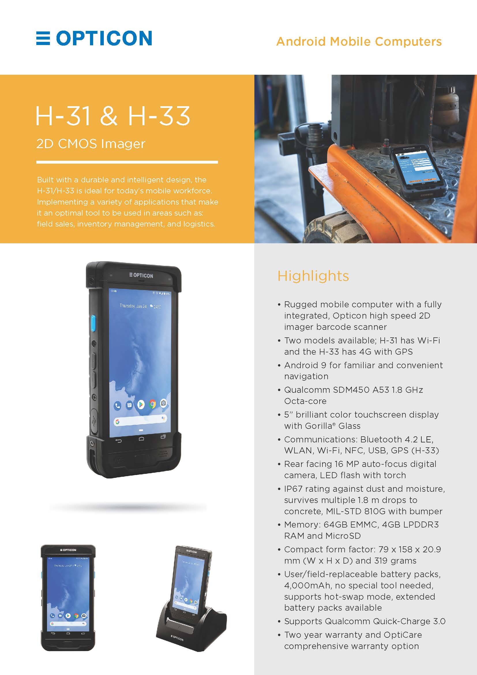OPTICON H-31/H-33 là thiết bị kiểm kho PDA hiệu suất cao sử dụng hệ điều hành Android. Khả năng xử lý tốc độ cao, đa tính năng kết nố i , Sản phẩm có những cải tiến vượt bậc về kiểu dáng và cấu hình, với các chức năng của một PDA kết hợp cùng điện thoại thông minh, H-31/H-33 đặc biệt thích hợp với những người dùng làm việc di động, cần những thiết bị nhận diện tự động, kinh doanh và đa dạng các mục đích khác trong quản lý hàng hóa…