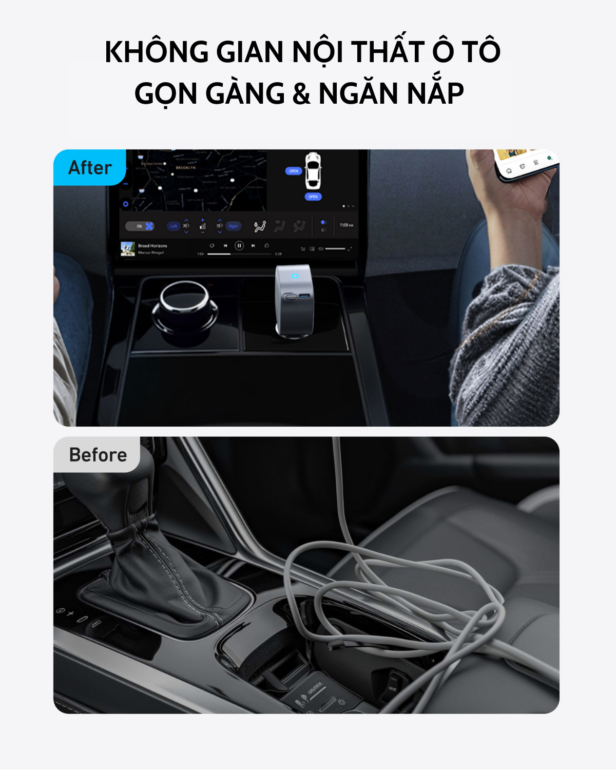 + Keep Your Car Organized: Giữ cho không gian xe hơi gọn gàng, ngăn nắp với thiết kế cáp thu gọn thông minh.