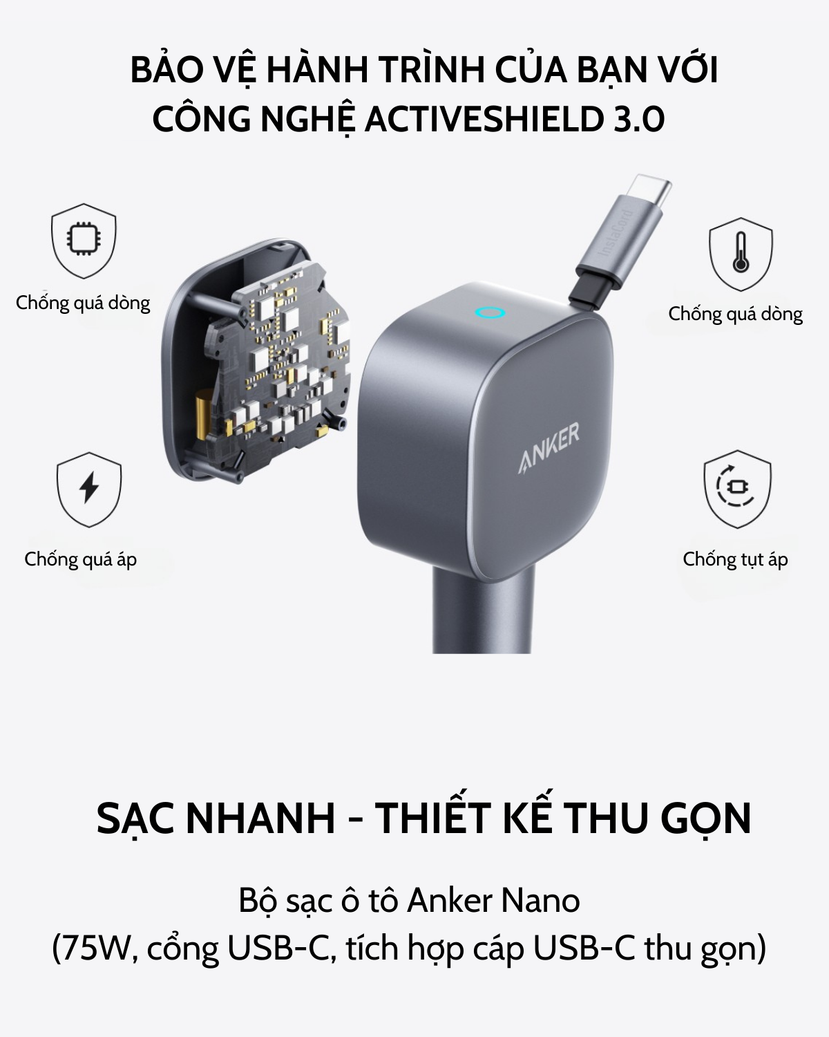 Tẩu sạc xe hơi Anker Nano 75W tích hợp 1 cáp USB-C (Một cổng USB-C 30W) sạc 2 thiết bị hỗ trợ PPS, PD, QC 3.0 – A2738