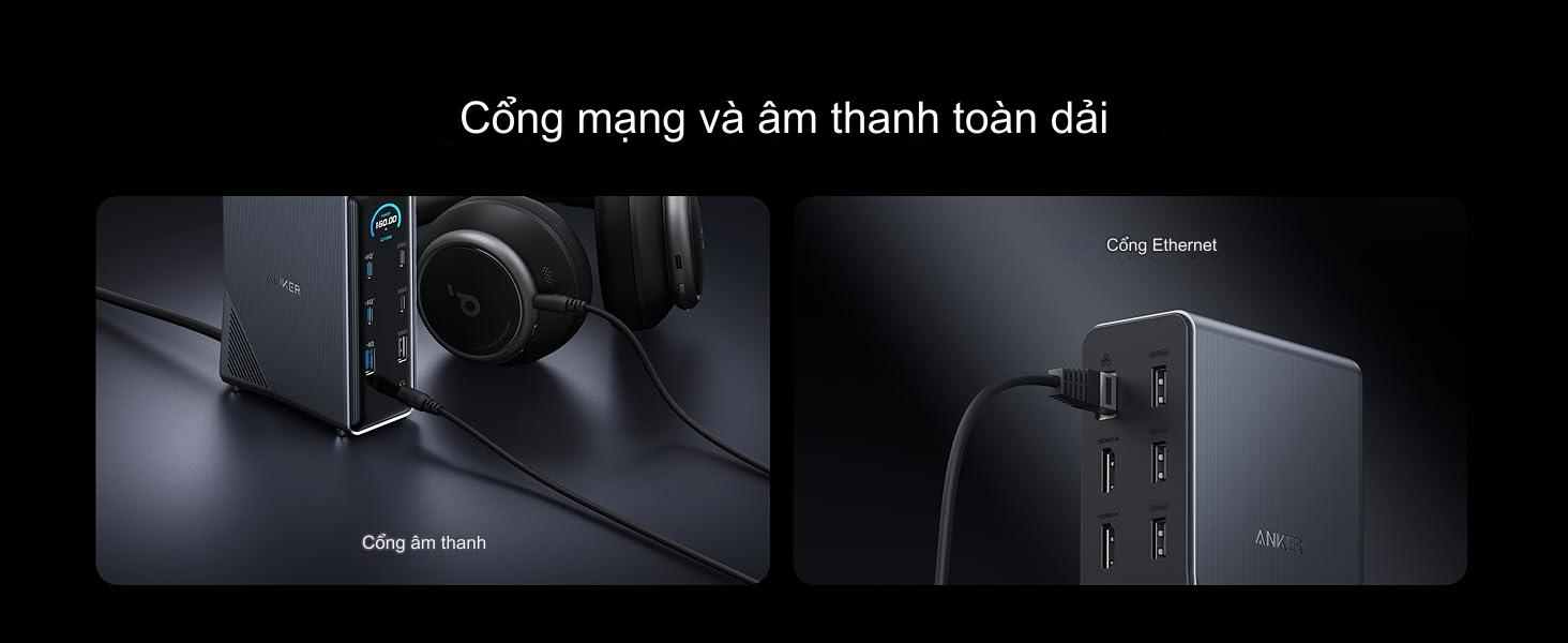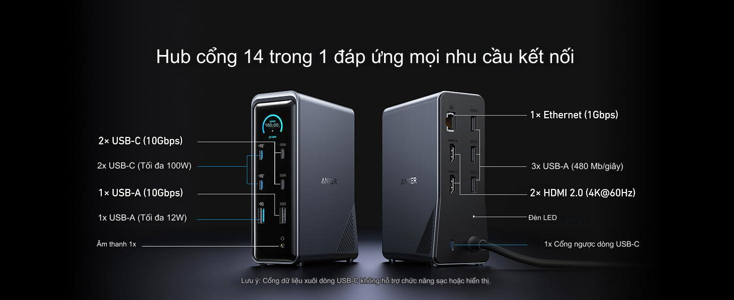 Kết nối tất cả các thiết bị của bạn với giải pháp 14 trong 1, hoàn hảo để sạc, truyền dữ liệu nhanh chóng và quản lý màn hình kép. Được trang bị nhiều cổng kết nối, bao gồm bốn cổng USB-C và năm cổng USB-A, cùng với cổng HDMI kép để xuất hình ảnh độ nét cao và các cổng âm thanh và Ethernet chuyên dụng.