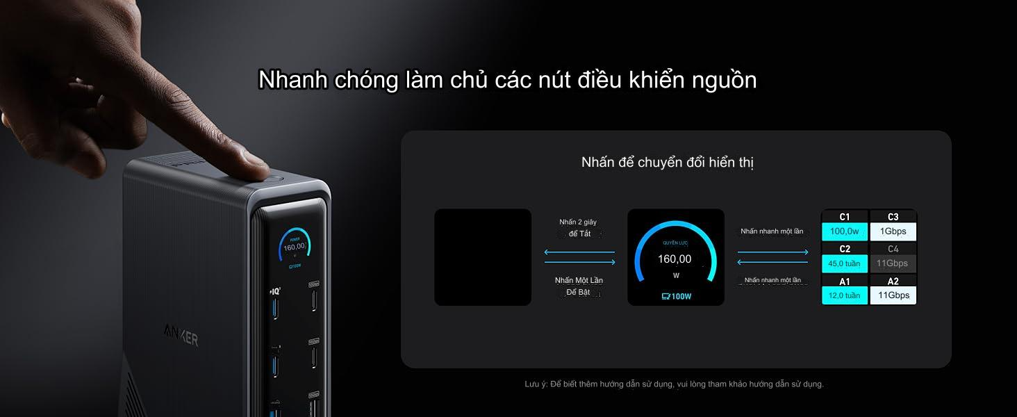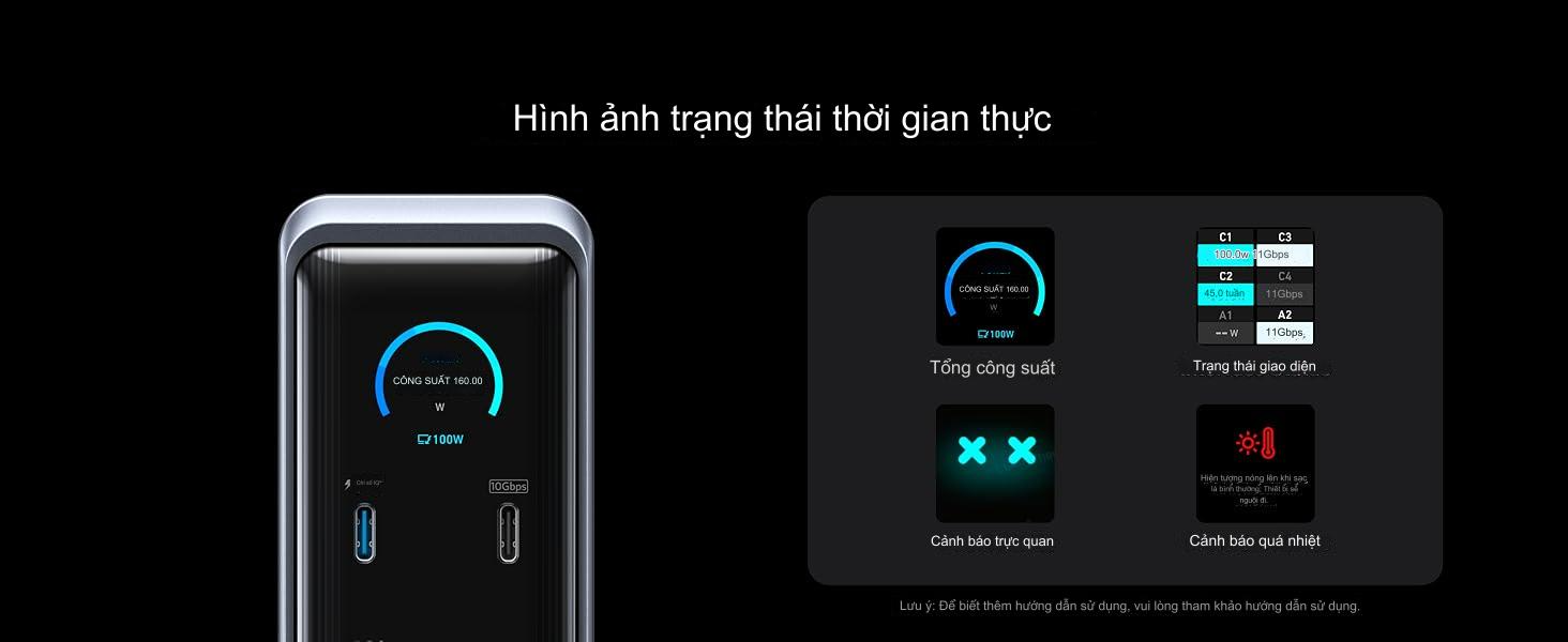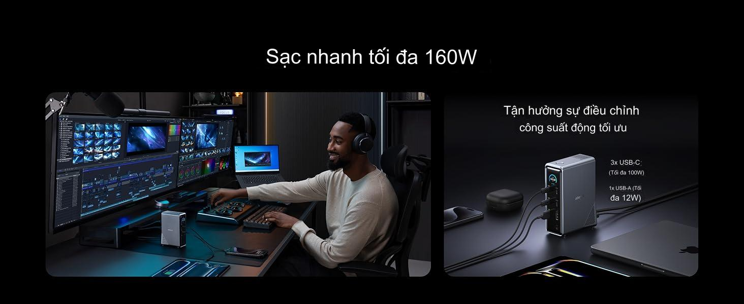 Cung cấp nguồn điện mạnh mẽ với tổng công suất 160W, có khả năng sạc cùng lúc bốn thiết bị thông qua ba cổng USB-C, mỗi cổng có công suất tối đa 100W và một cổng USB-A, công suất tối đa 12W.
