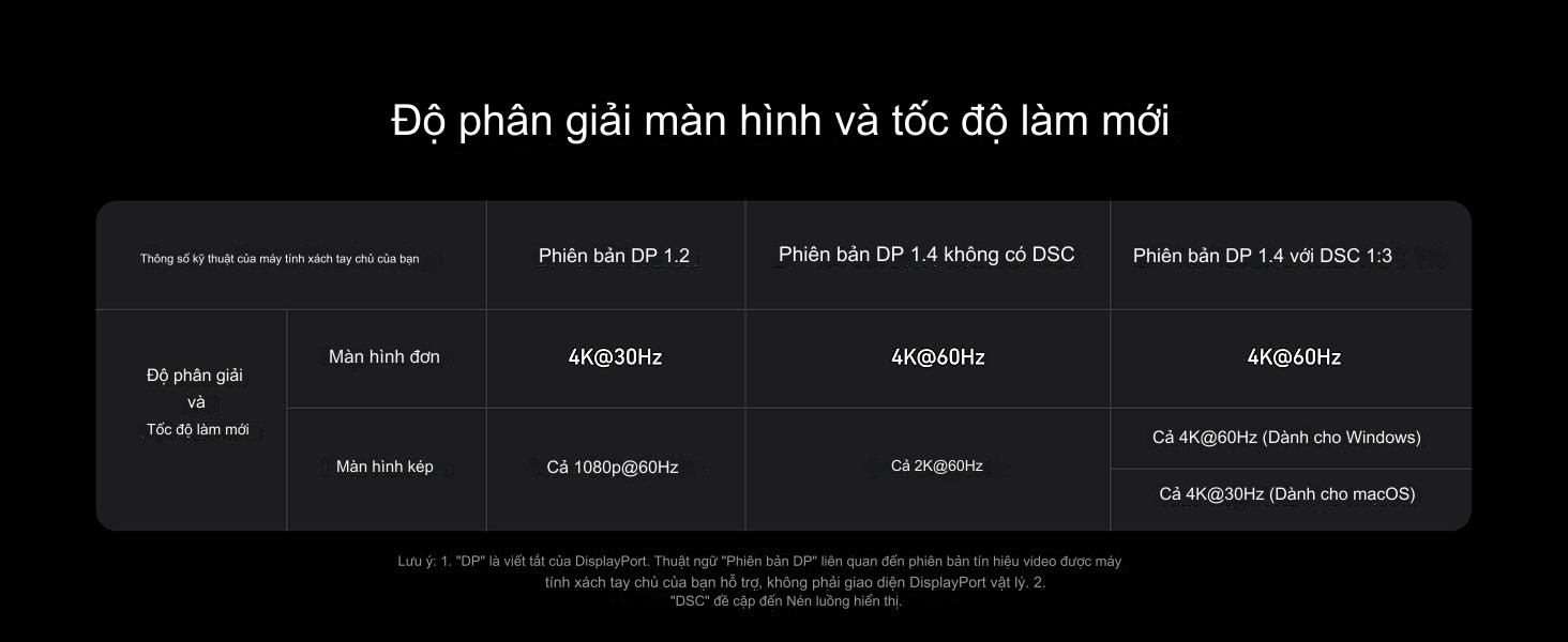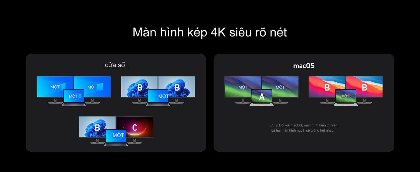 Thay đổi cách bạn làm việc và giải trí với màn hình kép 4K mang đến màu sắc sống động và chi tiết sắc nét ở tần số 60Hz ổn định. (Lưu ý: macOS không hỗ trợ Multi-Stream Transport (MST).)
