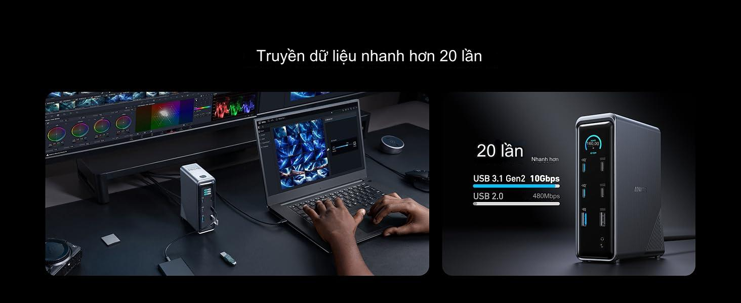 Quản lý dữ liệu hiệu quả trên nhiều thiết bị với các cổng đa năng cung cấp tốc độ lên tới 10Gbps, được bổ sung thêm tùy chọn hiển thị 4K và âm thanh kép.