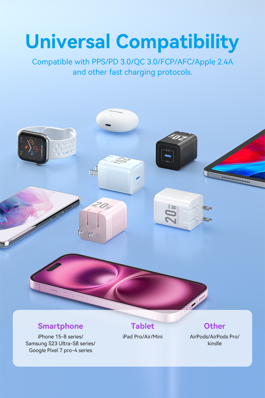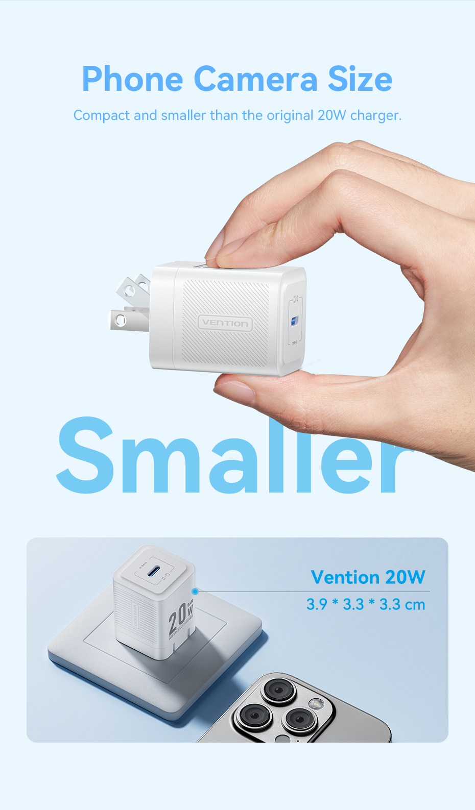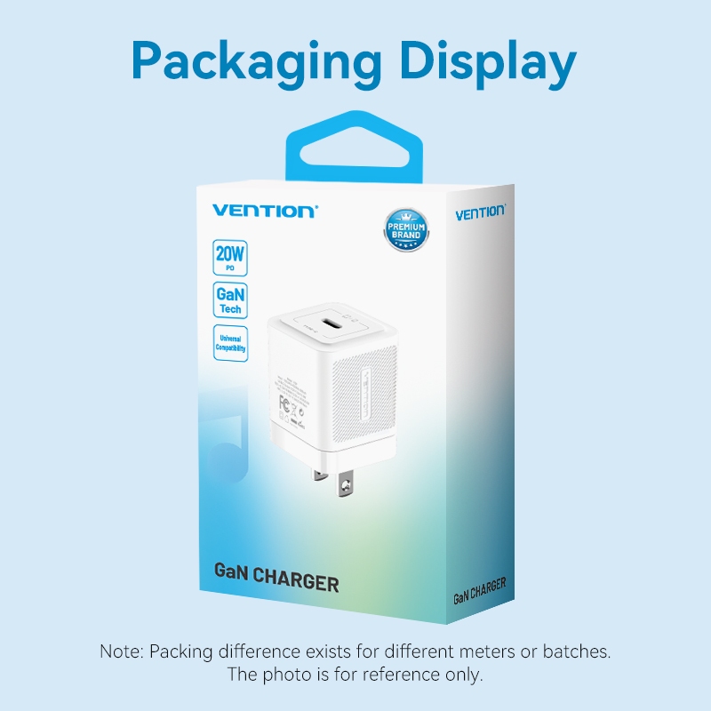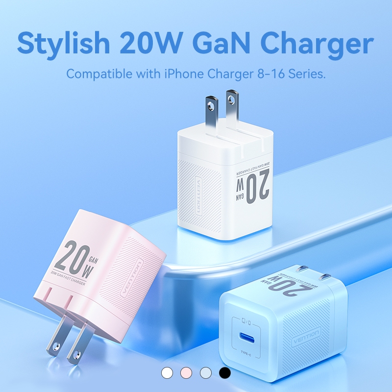 Vention 20W GaN USB C Sạc Nhanh PD 3,0 Sạc Tường Cắm QC 3,0 Bộ sạc Tương Thích Cho iPhone 16 Pro Max, Galaxy, Pixel 4 / 3, iPad Mini / Pro