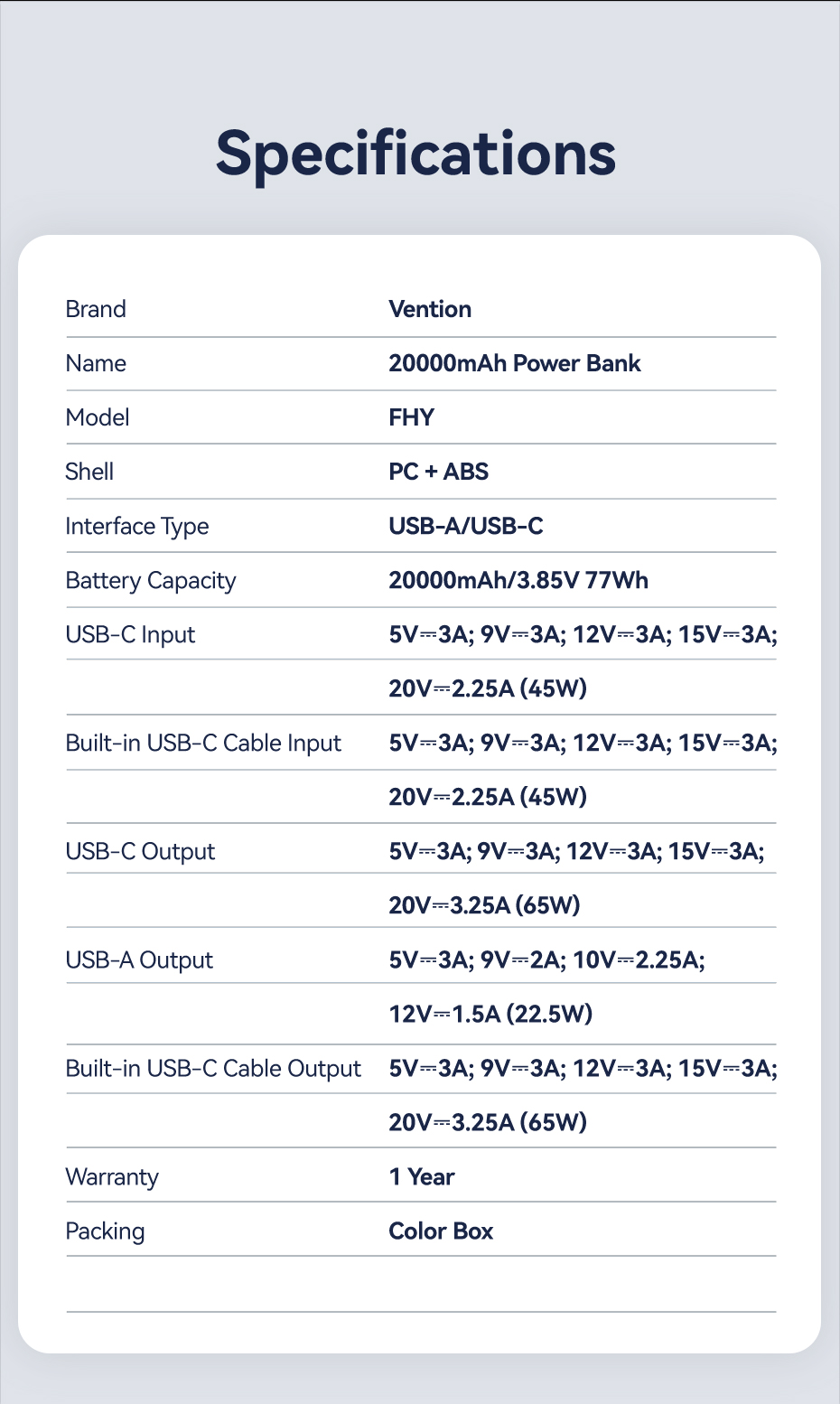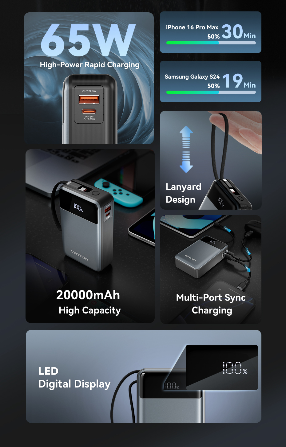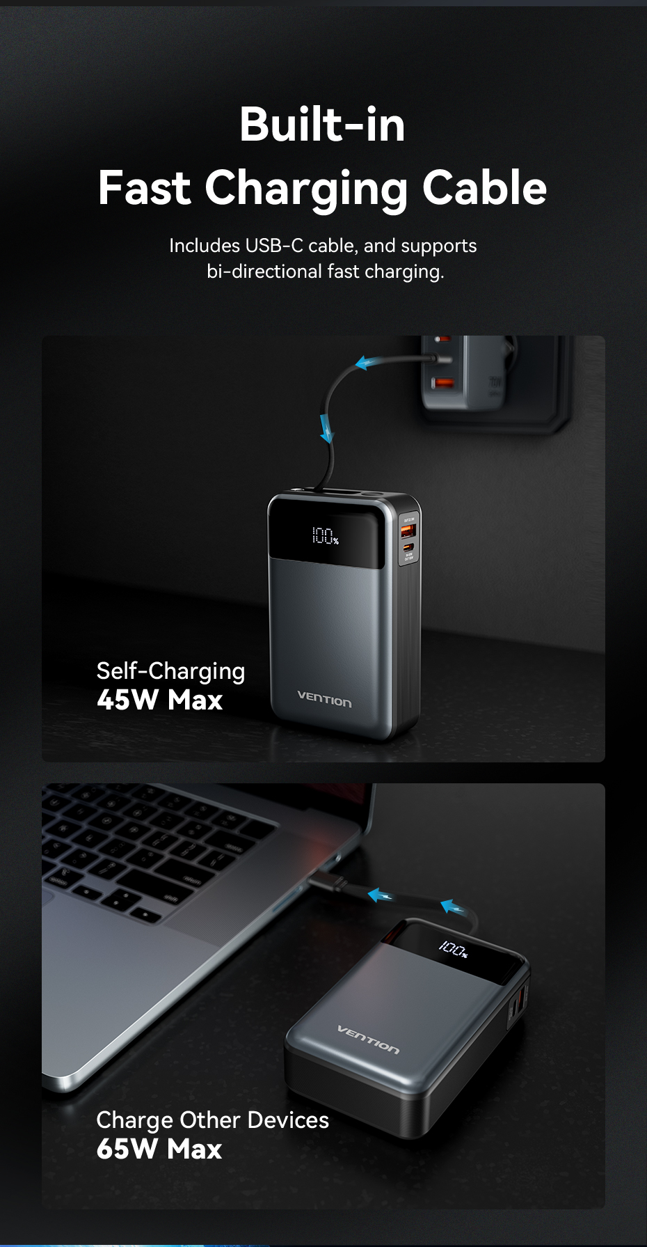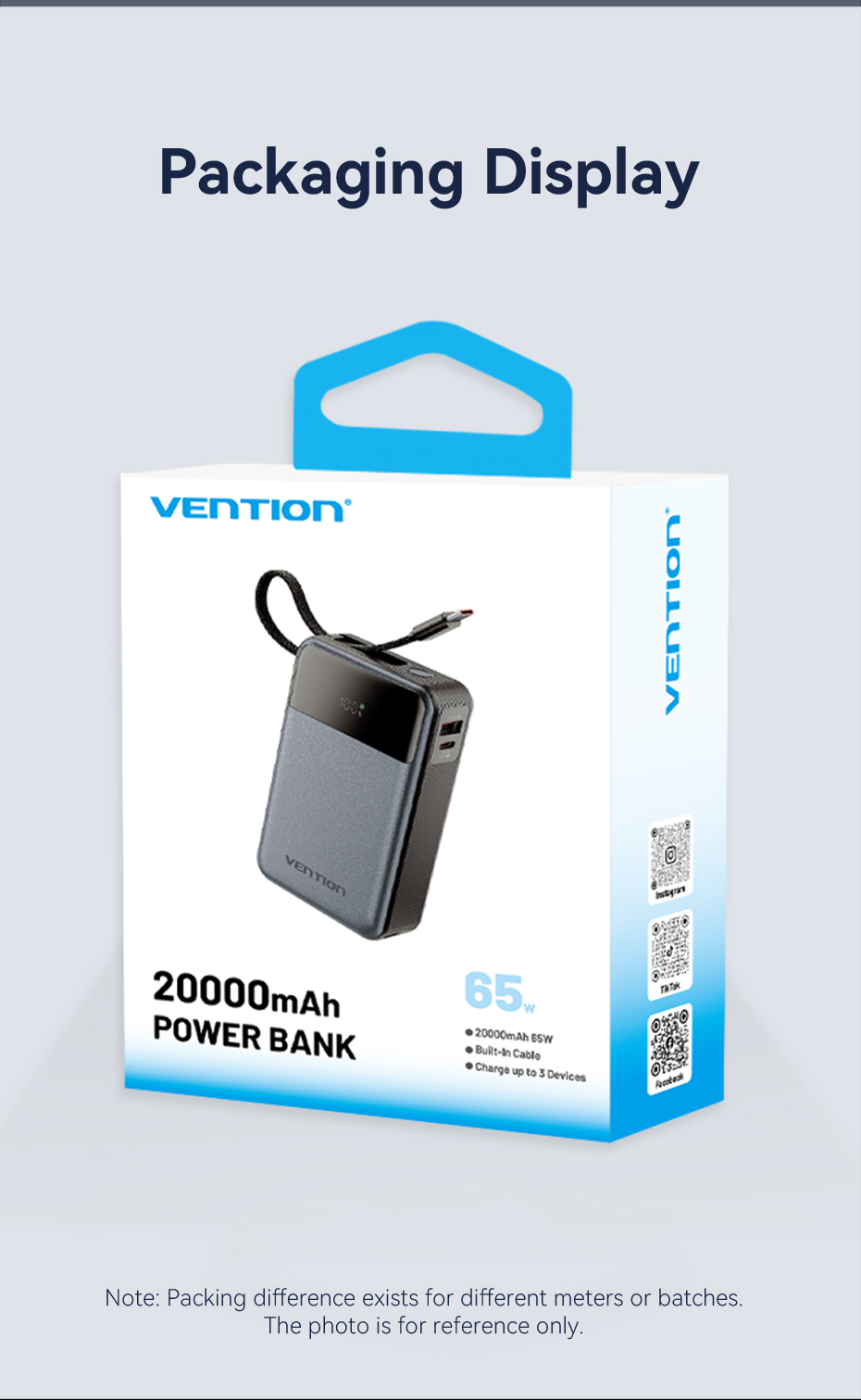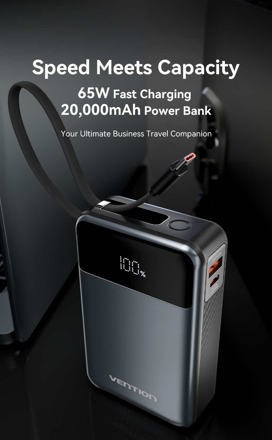 Vention 65W Power Bank có cáp 20000mAh Màn hình kỹ thuật số sạc nhanh PD ba chiều cho điện thoại