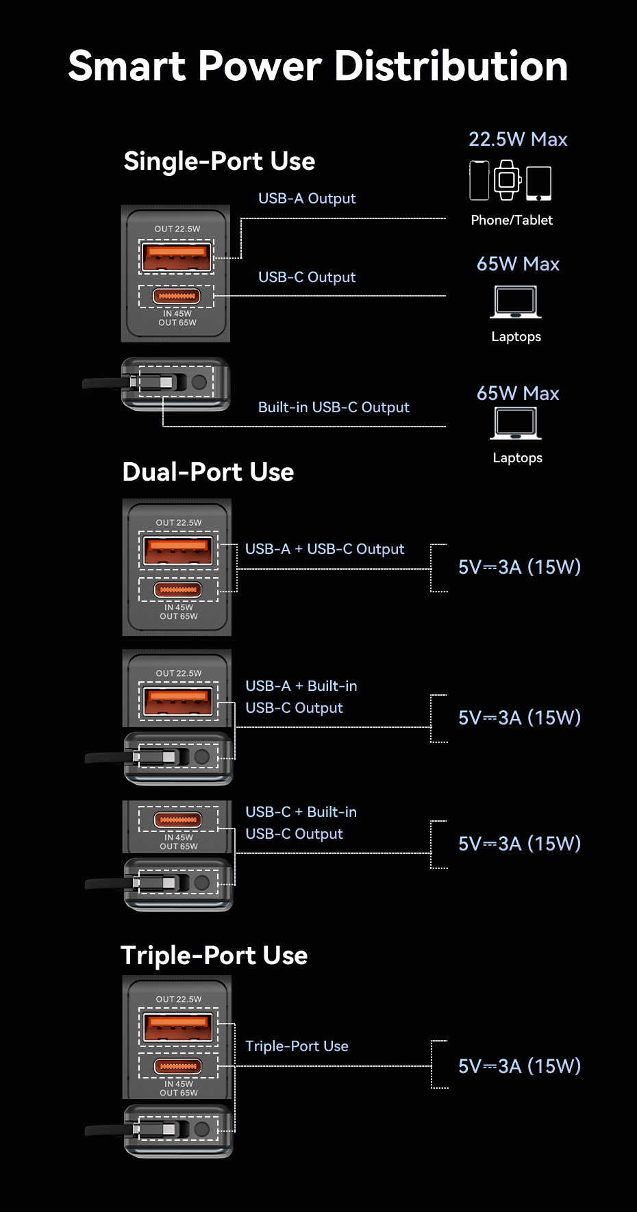 Đầu ra cáp USB-C tích hợp: 5V-3A; 9V-3A; 12V-3A; 15V-3A;